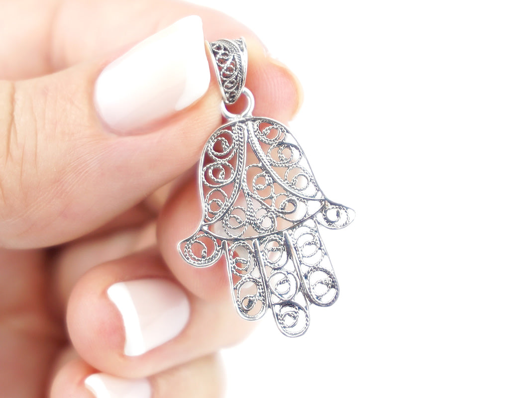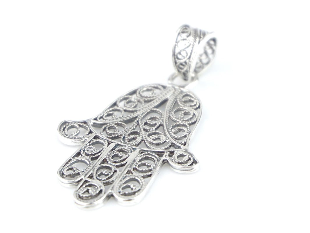 Elegant medium-sized Hand of Fátima pendant. Portuguese Filigree, crafted in Portugal in 925 Sterling Silver.