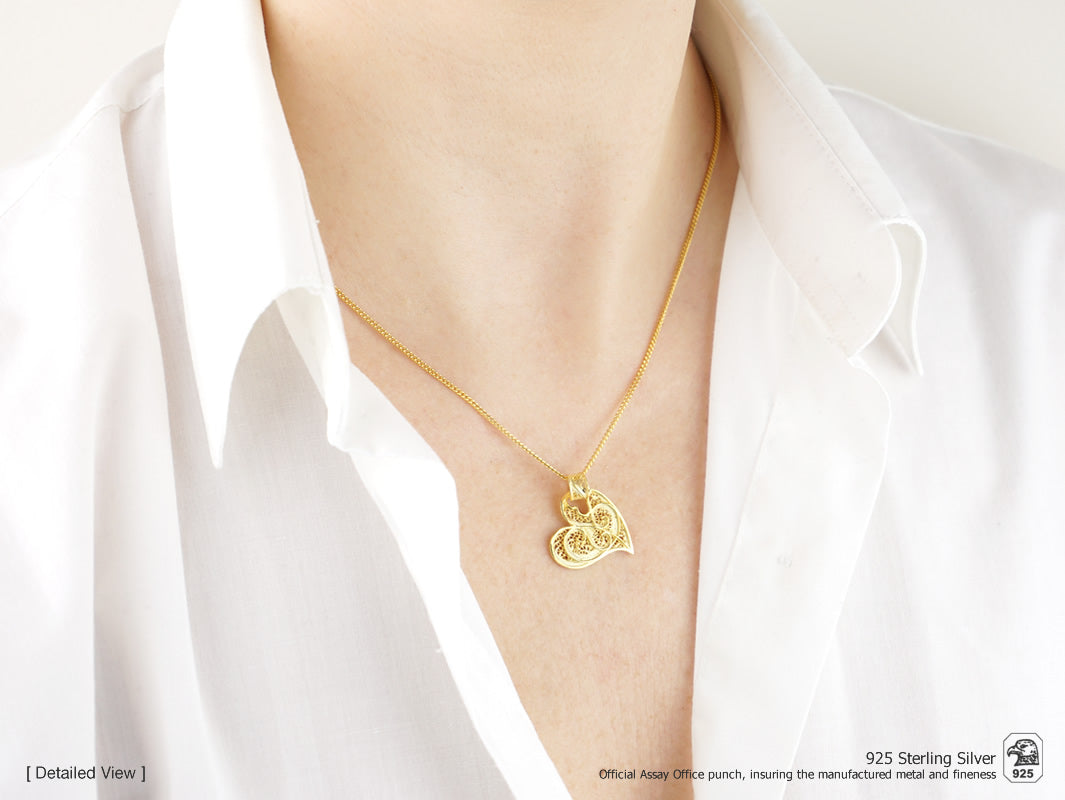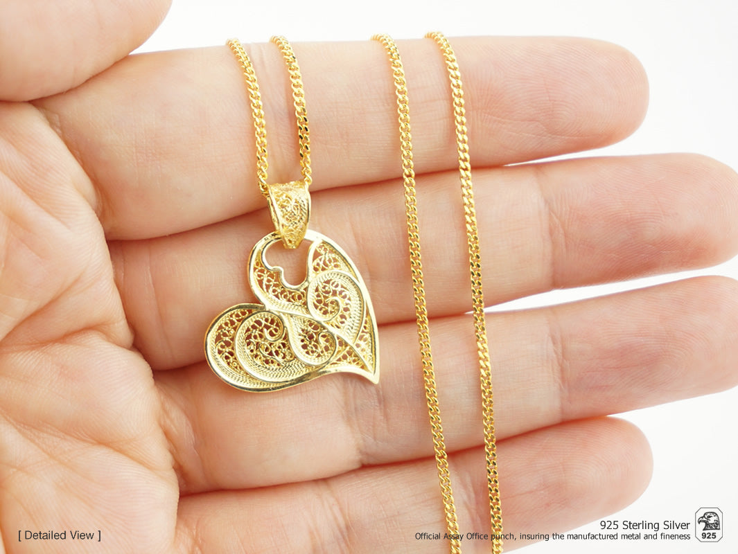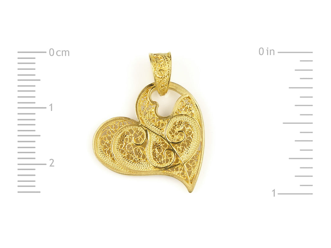 Necklace with Small Leaning Heart, Portuguese Filigree, Golden 925 Sterling Silver