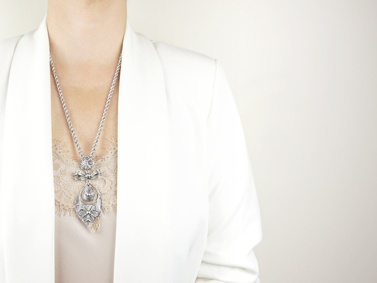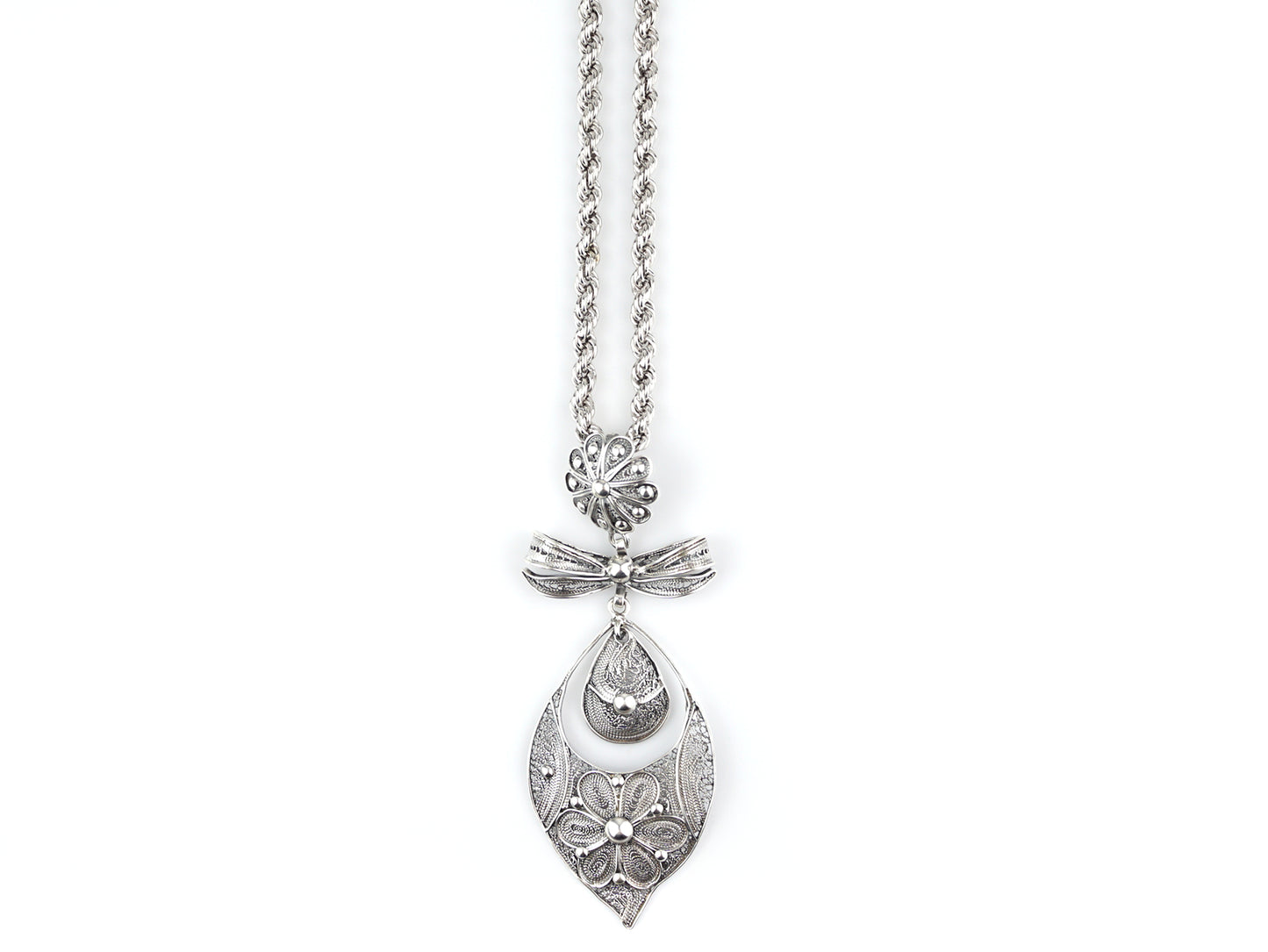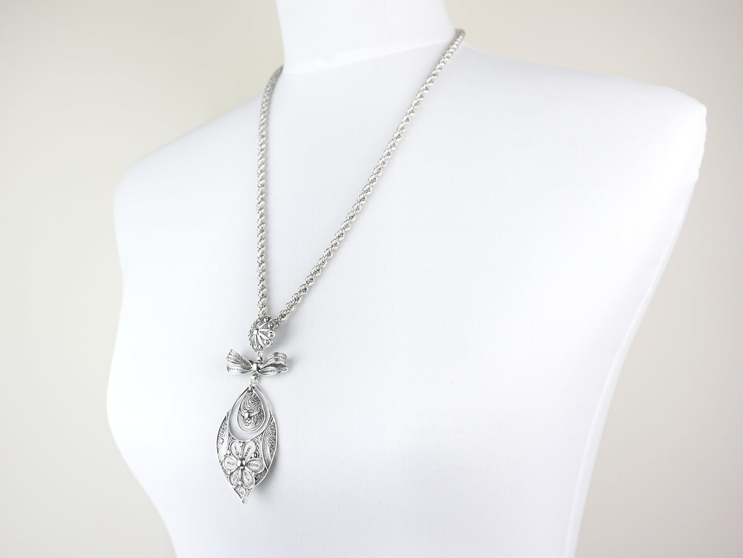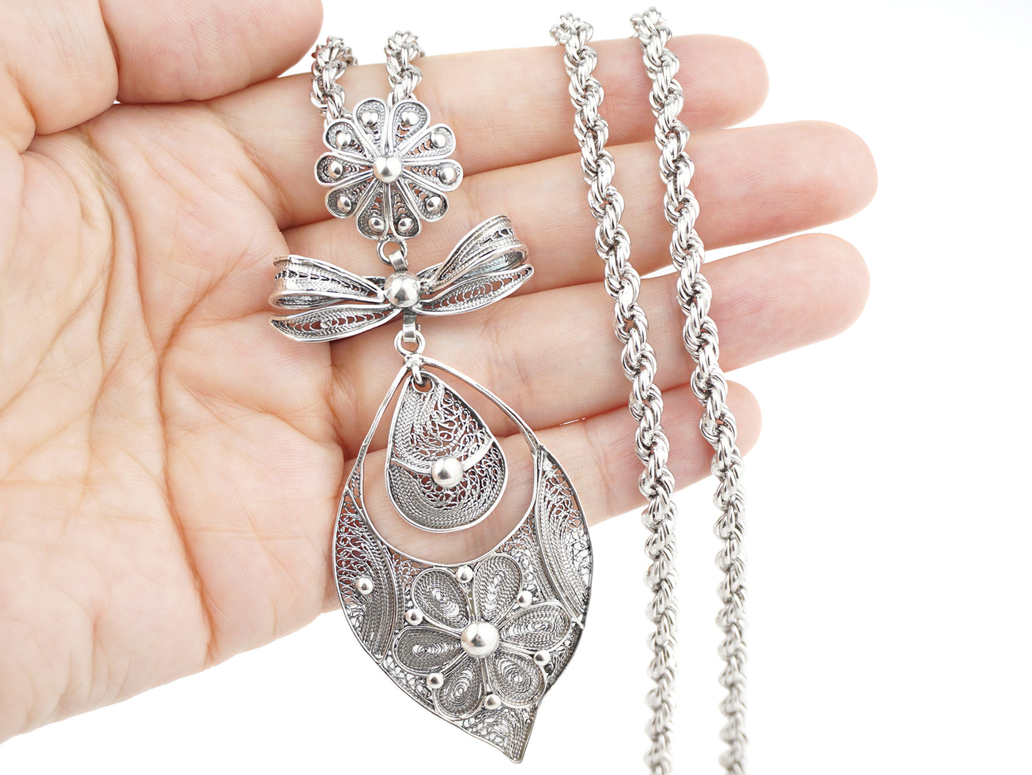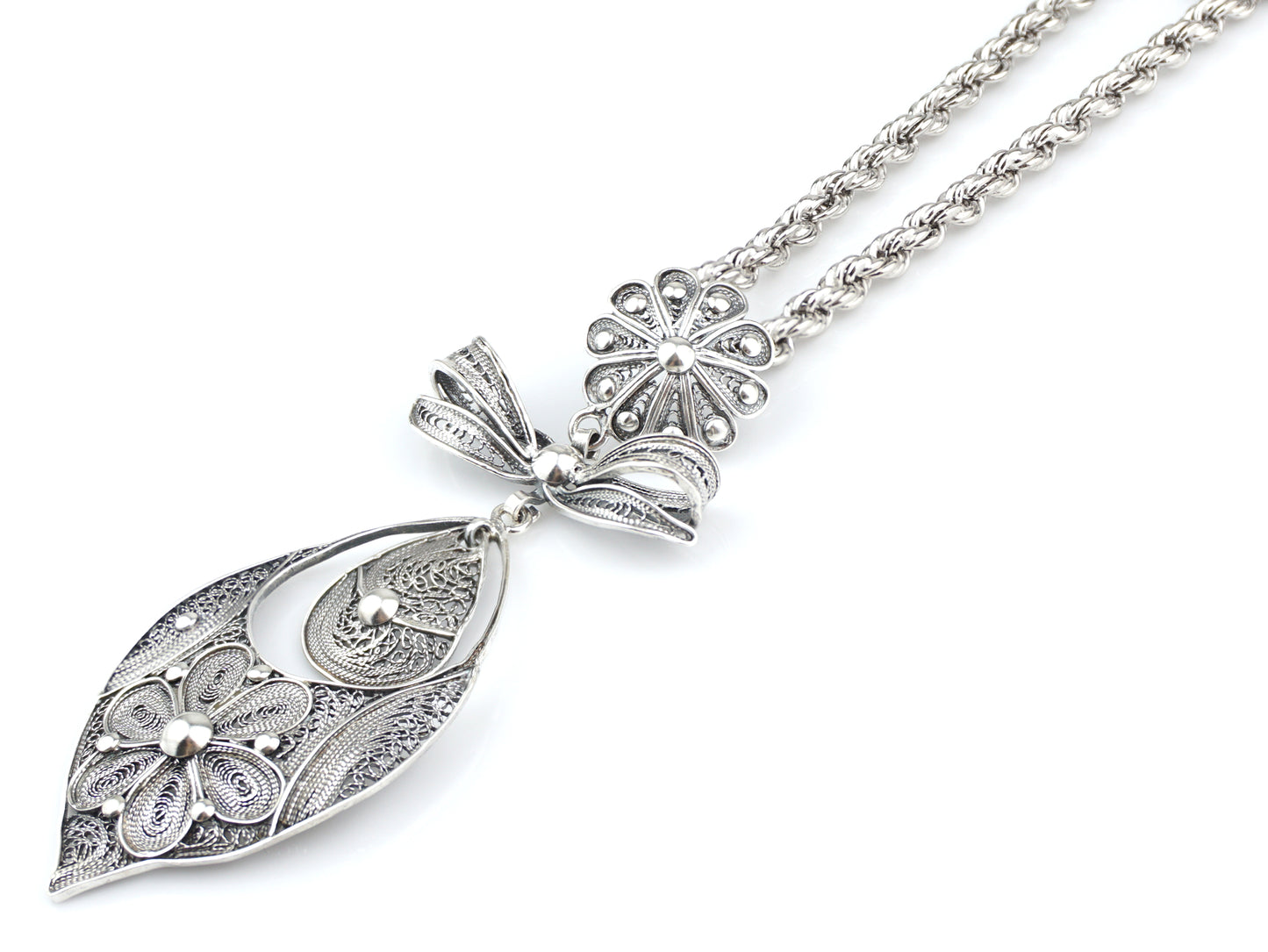 "Corda" Necklace with Large Rich Princess Pendant, Portuguese Filigree, 925 Sterling Silver