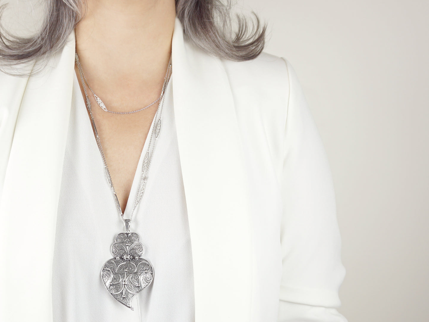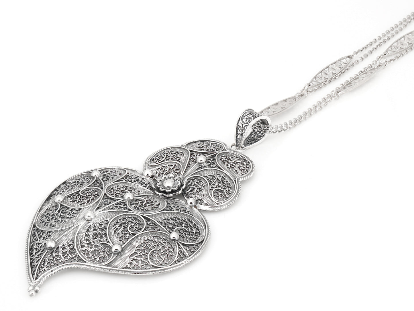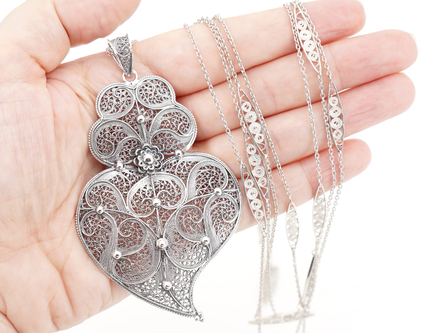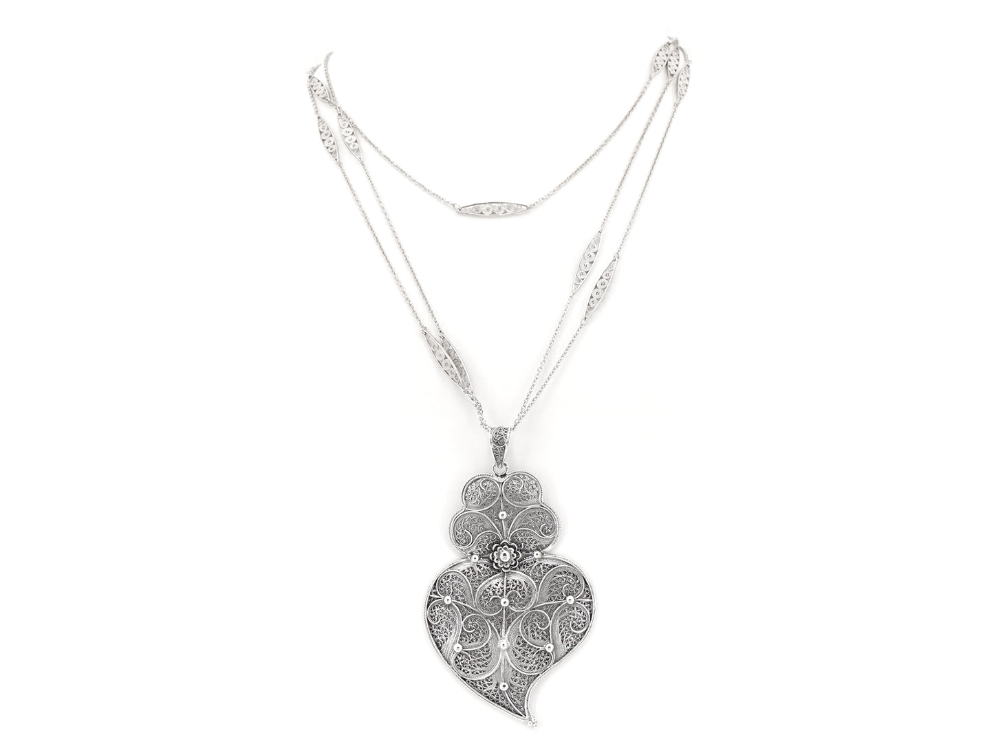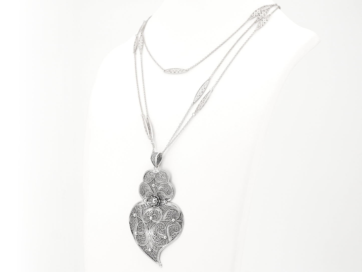 Elegant extra-long Trancelim Necklace with large-sized Viana Heart Pendant. Portuguese Filigree, crafted in Portugal in 925 Sterling Silver.