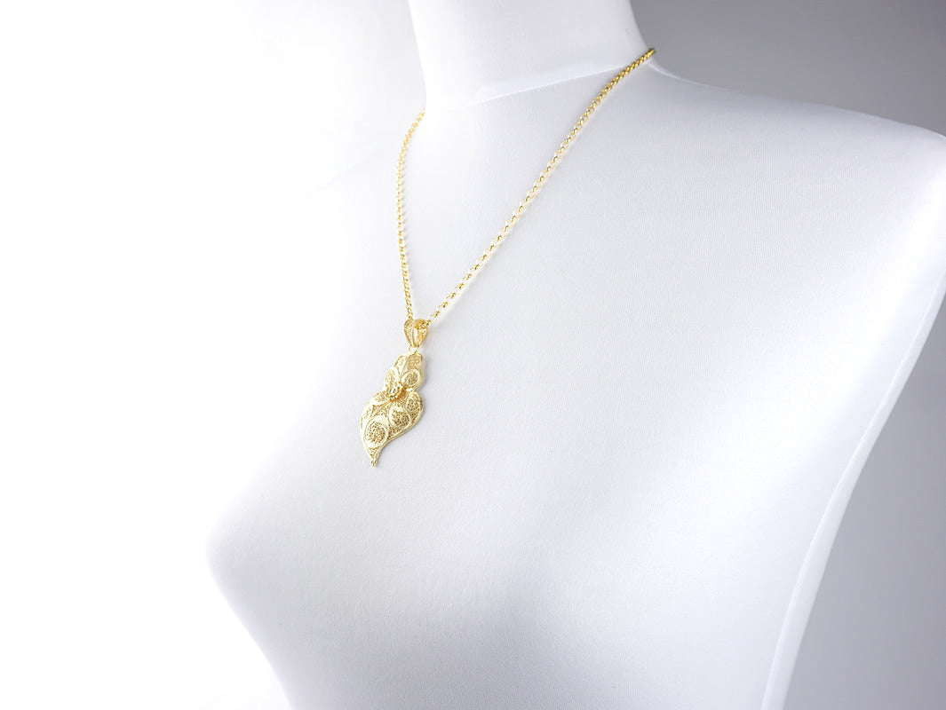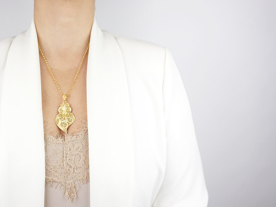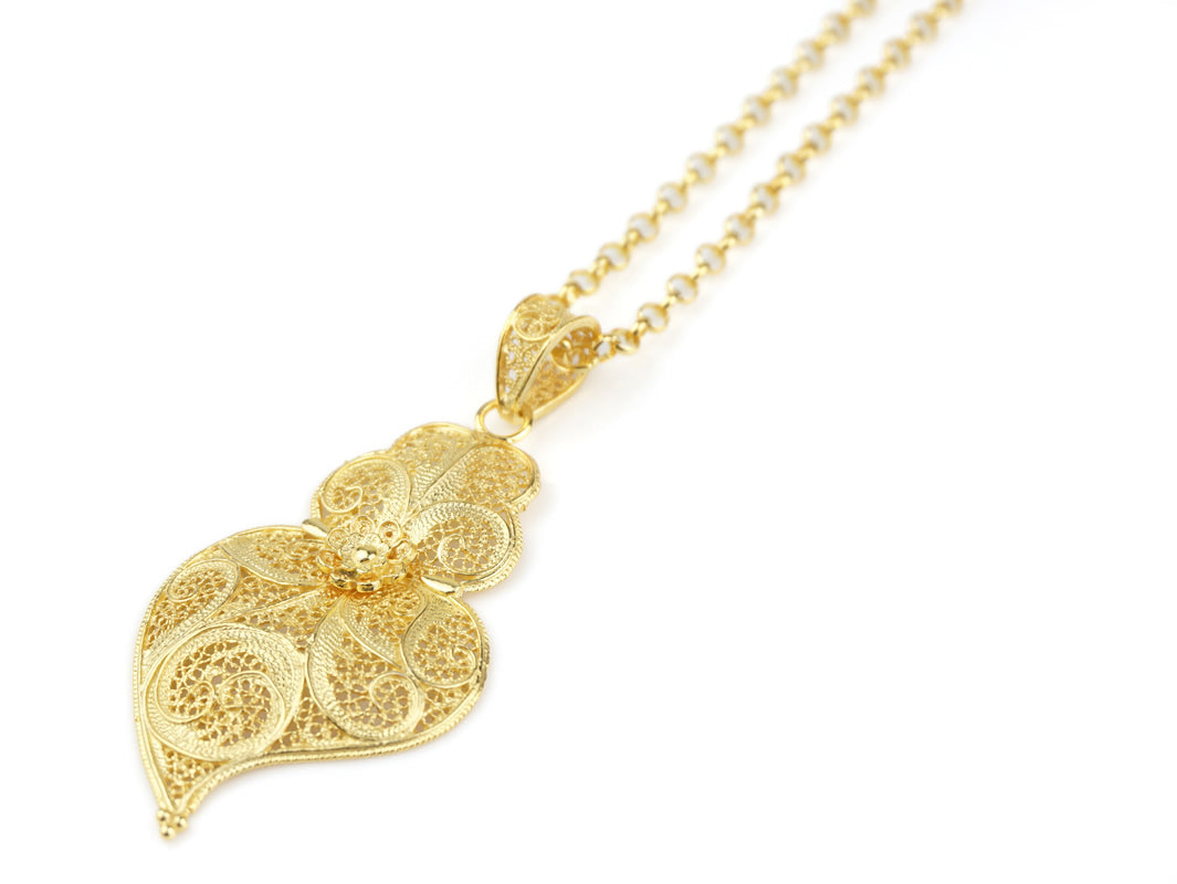 Elegant Necklace with medium-sized Viana Heart Pendant. Portuguese Filigree, crafted in Portugal in Golden 925 Sterling Silver.