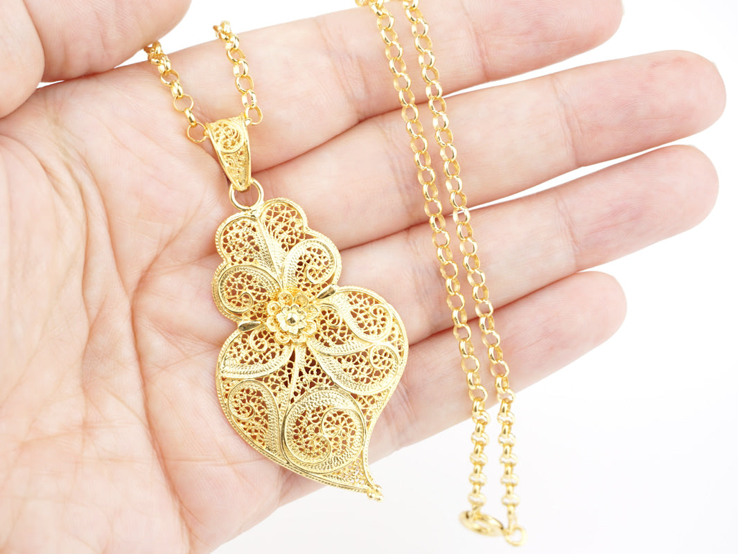 Necklace with Medium Viana Heart, Portuguese Filigree, Golden 925 Sterling