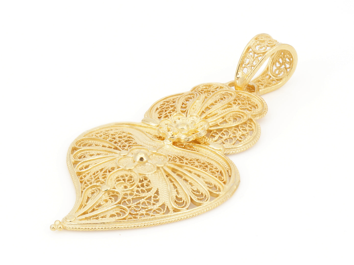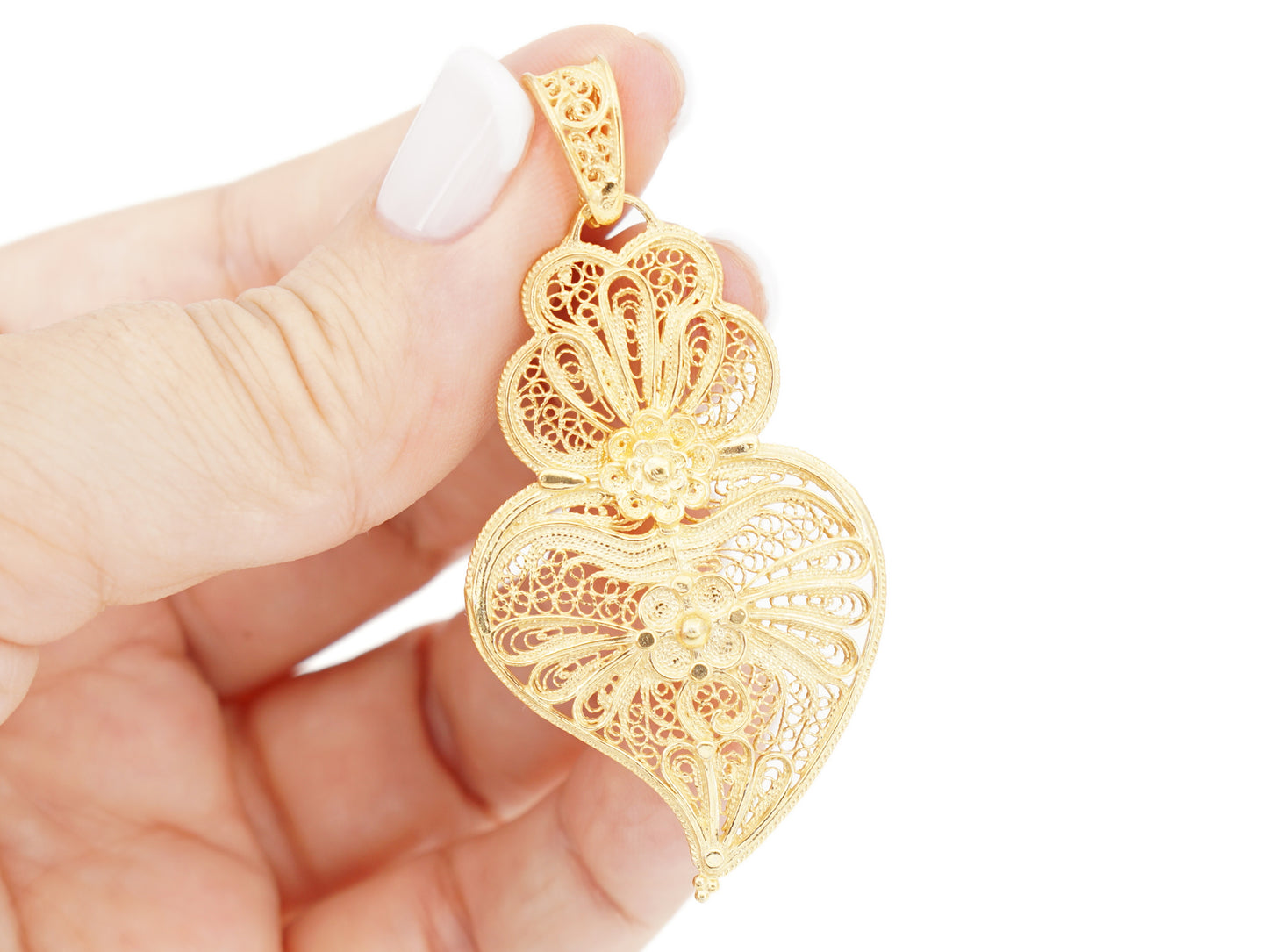 Medium-sized Viana Heart Pendant, Portuguese Filigree, Golden 925 Sterling Silver