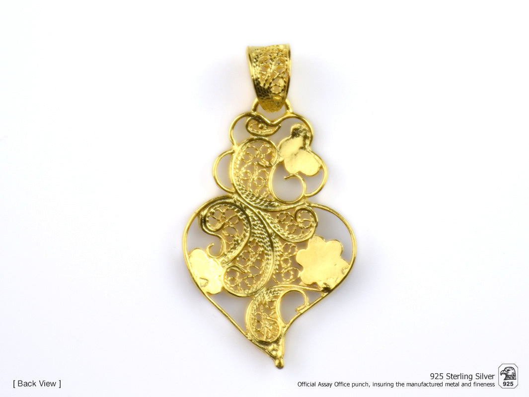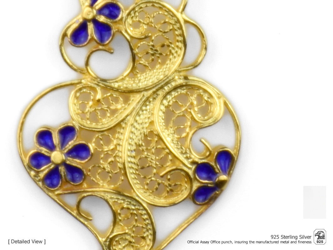 Necklace with Small Heart with Enamel Flowers, Portuguese Filigree, Golden 925 Sterling Silver