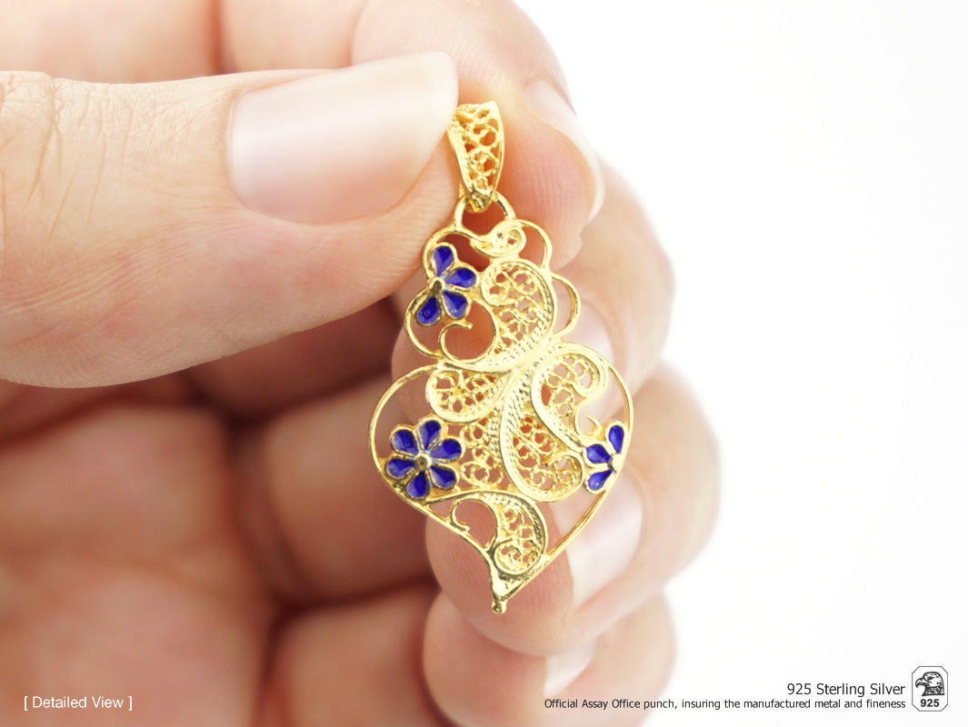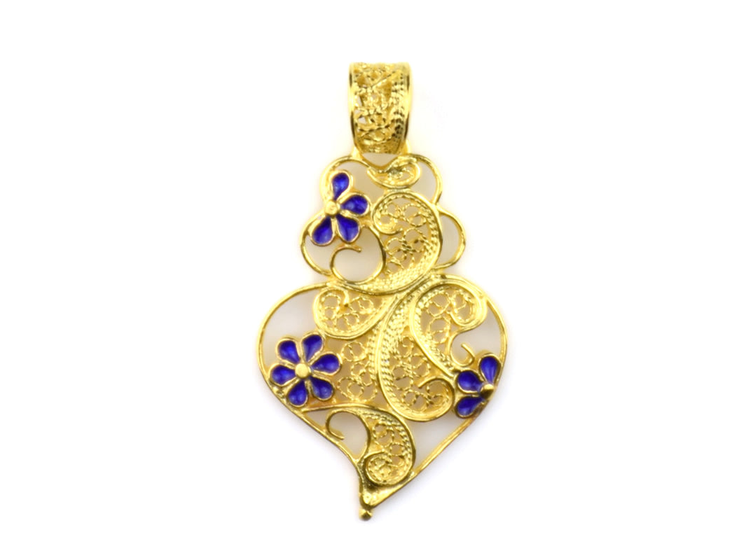 Elegant Small Heart with Enamel Flowers Pendant. Portuguese Filigree, crafted in Portugal in Golden 925 Sterling Silver.