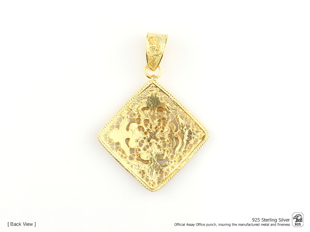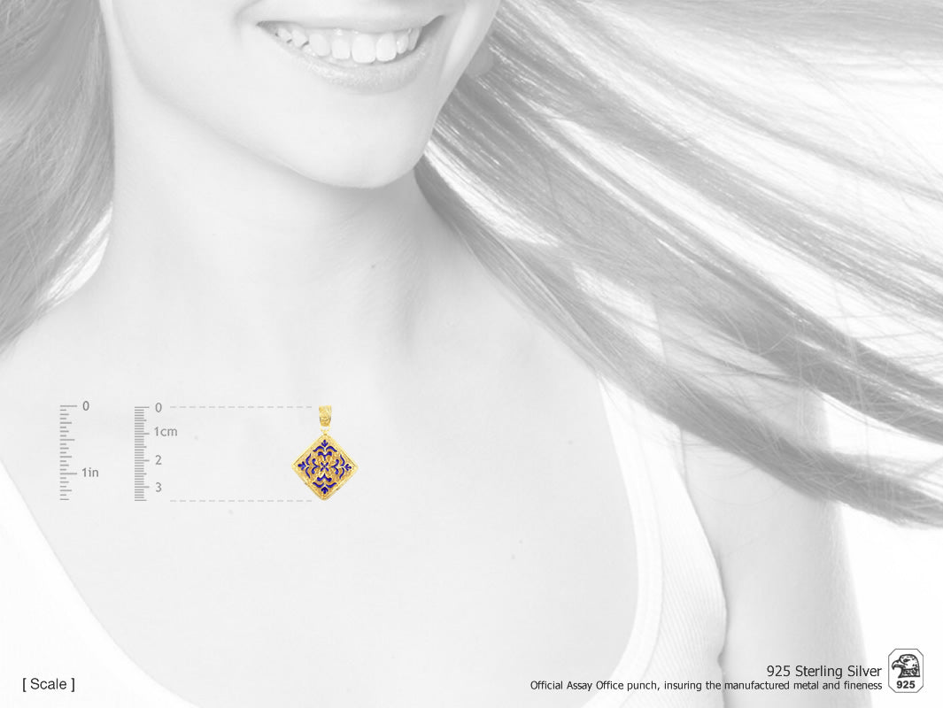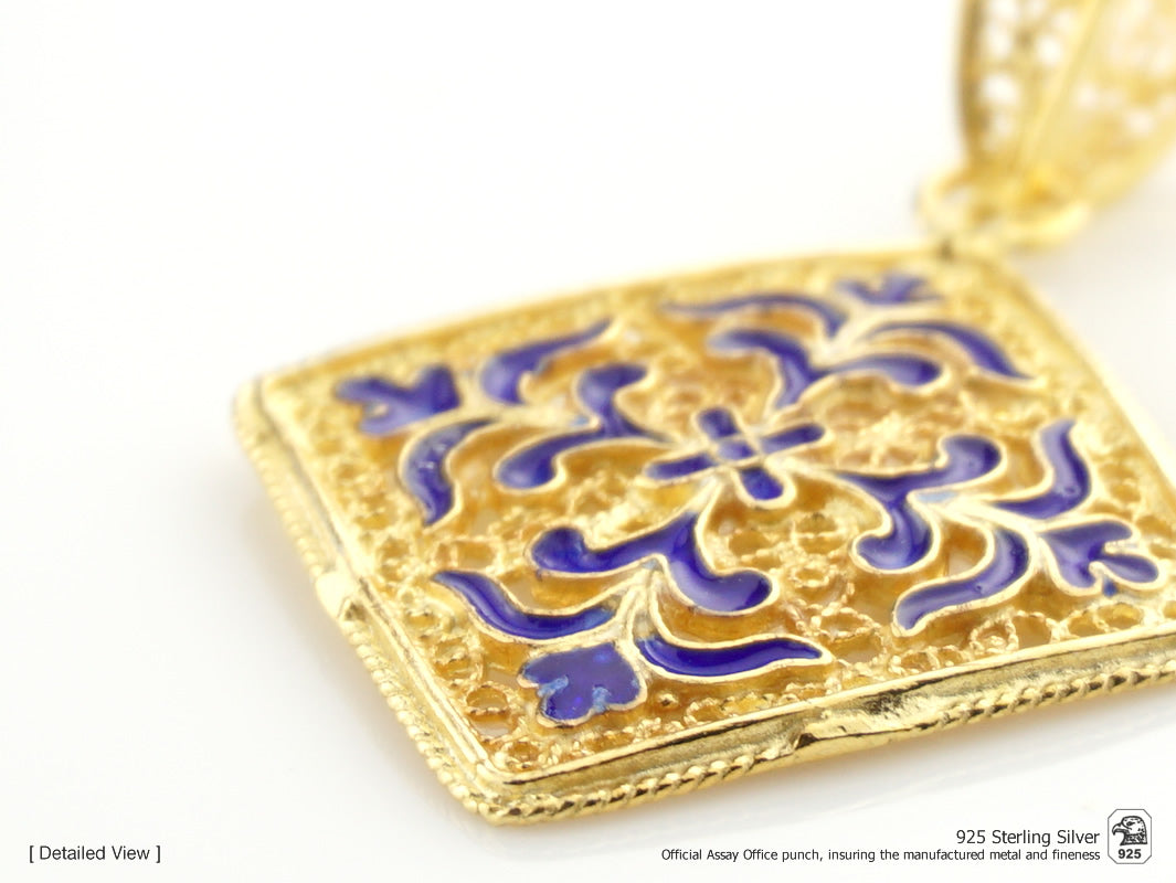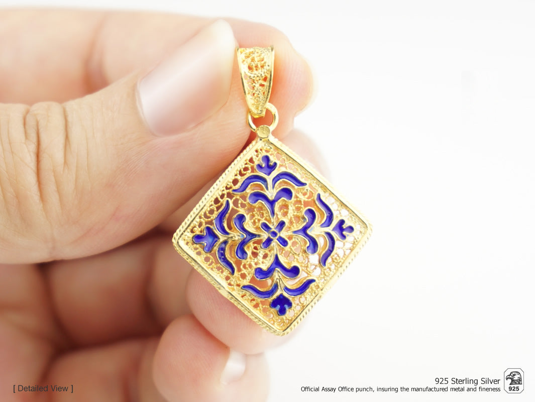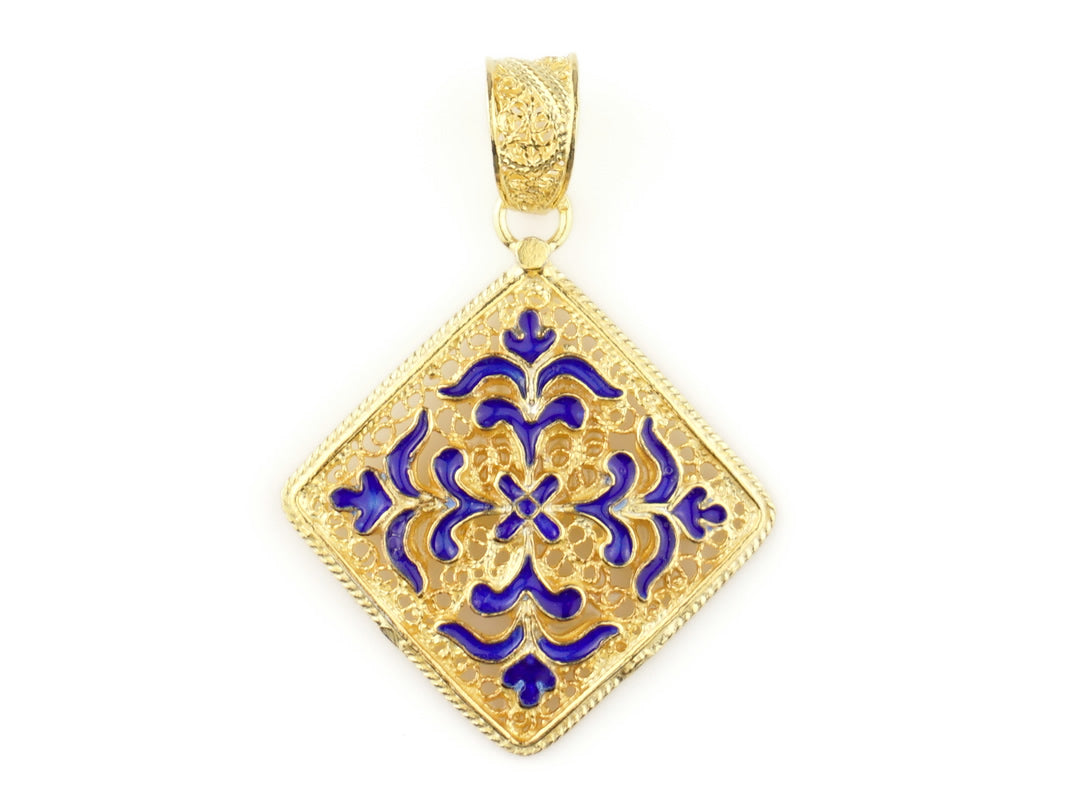 Elegant Enameled Tile Pendant. Portuguese Filigree, crafted in Portugal in Golden 925 Sterling Silver.