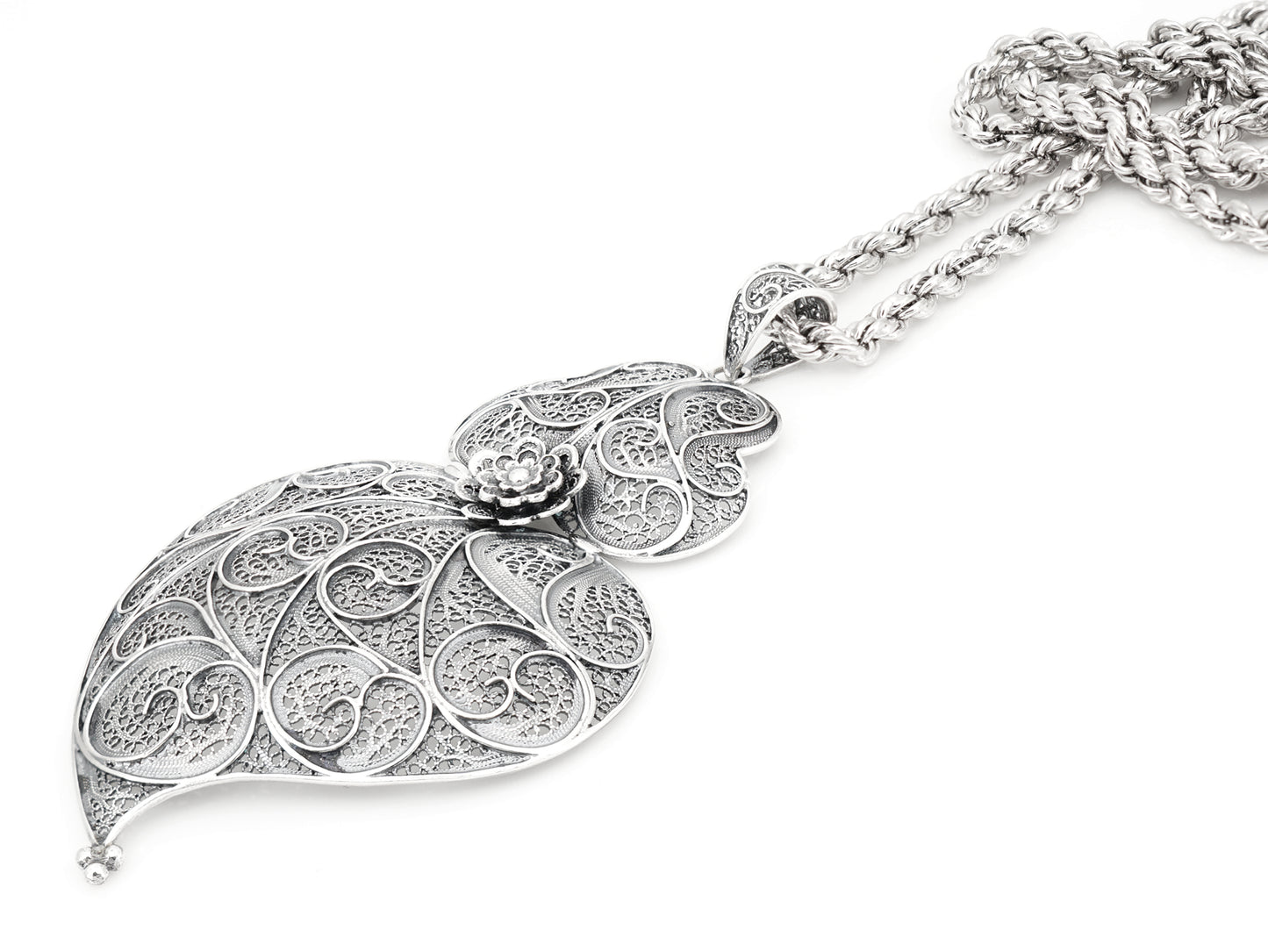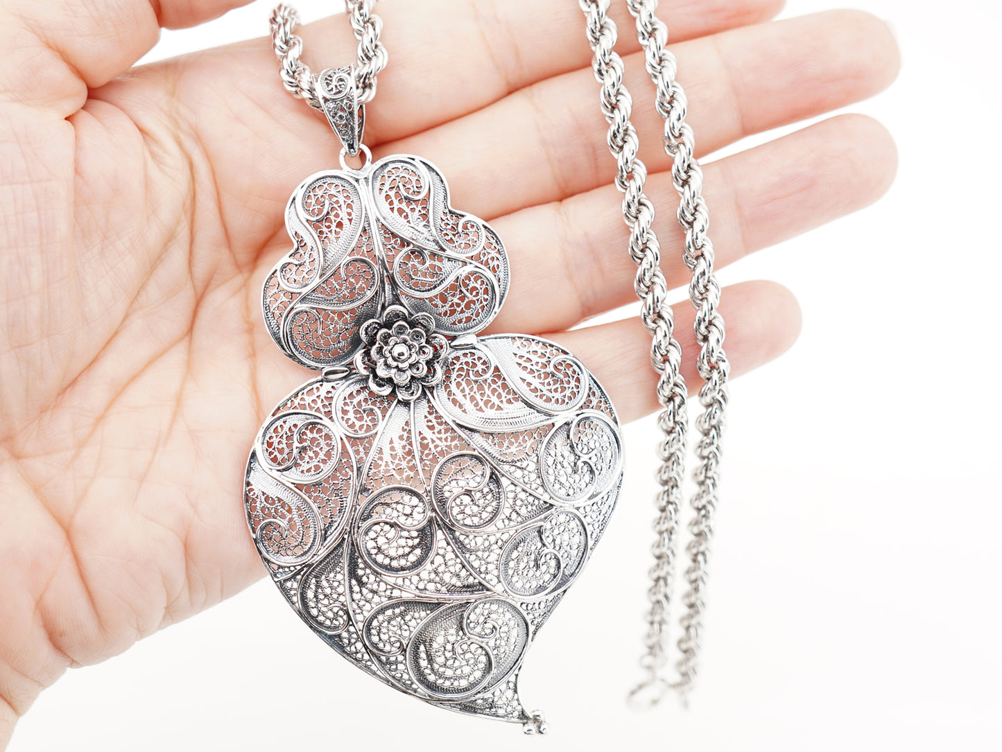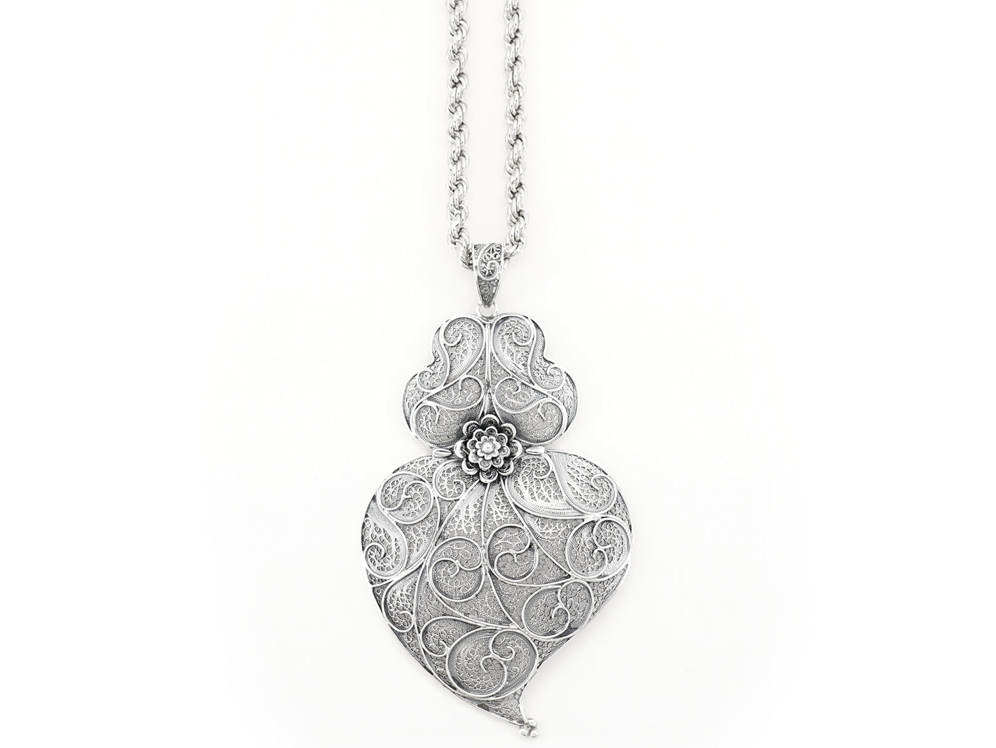 Elegant Traditional Twisted "Corda" Necklace with Large Traditional Viana Heart. Portuguese Filigree, crafted in Portugal in 925 Sterling Silver.