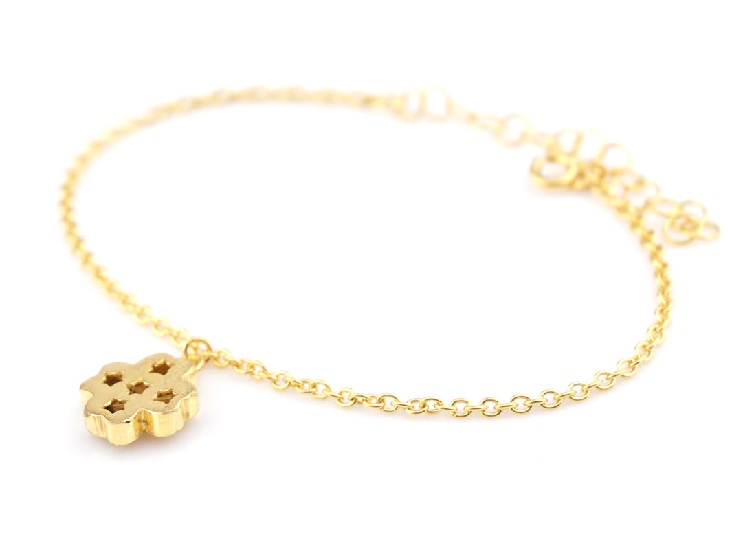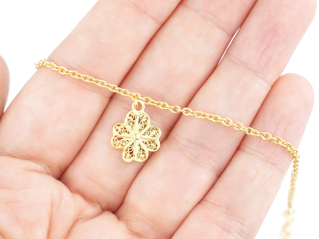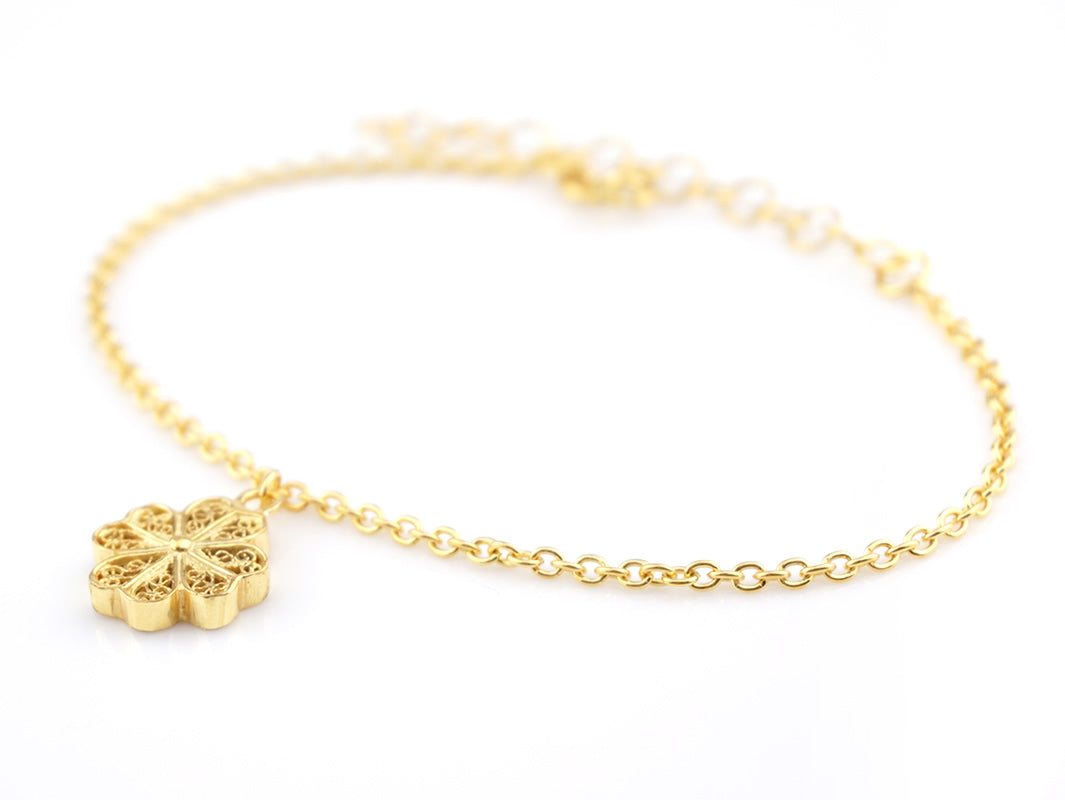 Elegant Bracelet with Clover charm. Portuguese Filigree, crafted in Portugal in Golden 925 Sterling Silver.