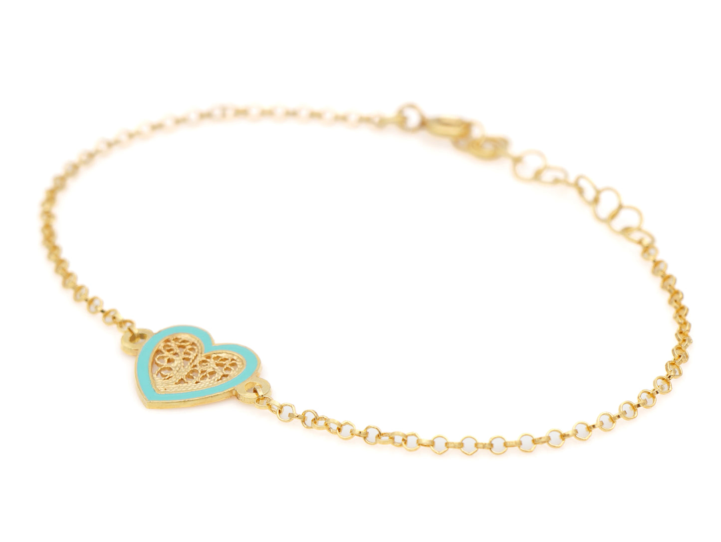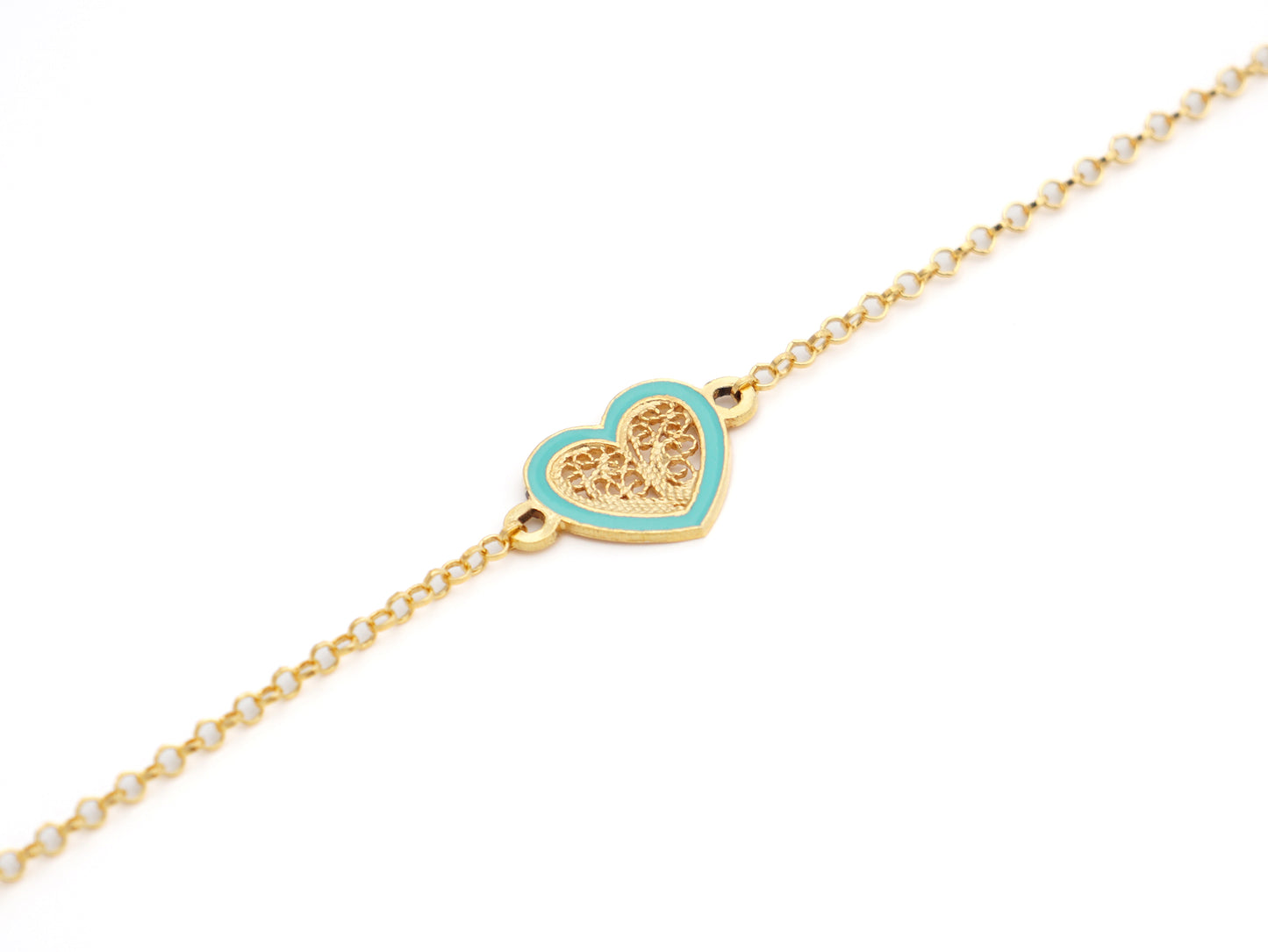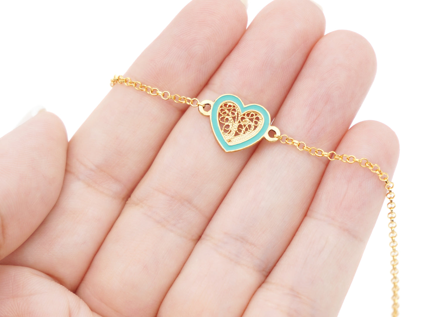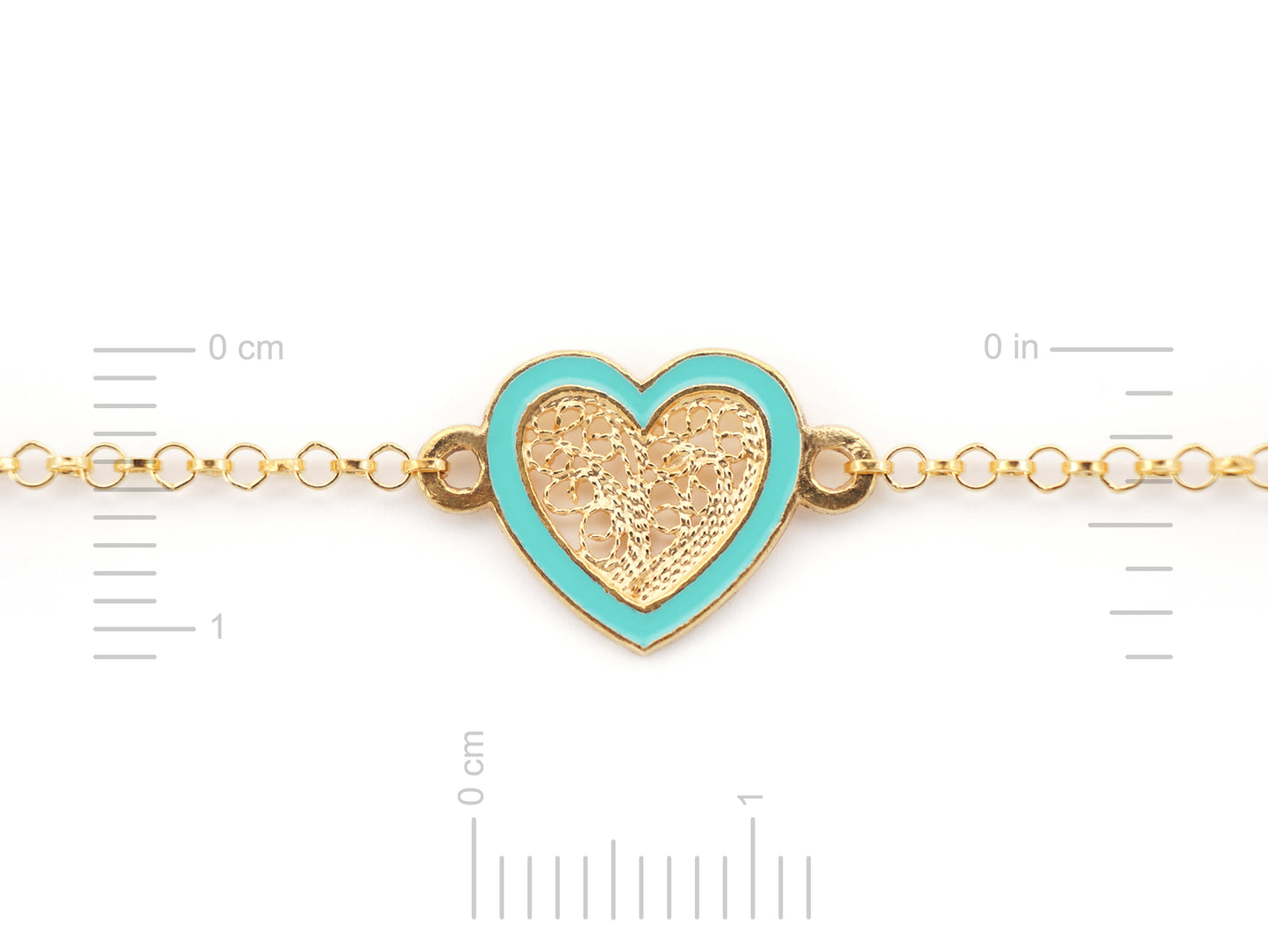 Elegant Small Heart Bracelet with Turquoise Enamel. Portuguese Filigree, crafted in Portugal in Golden 925 Sterling Silver.
