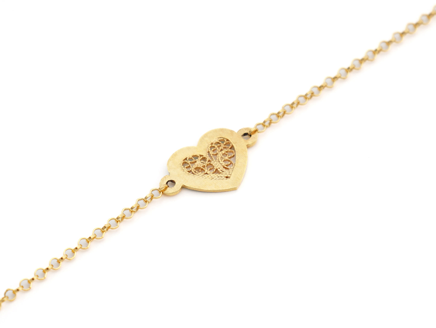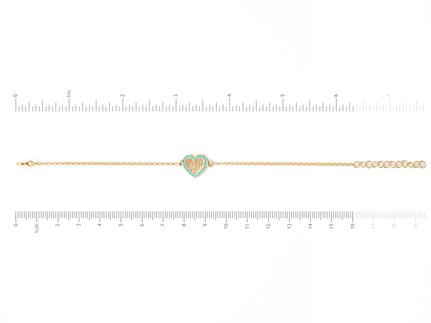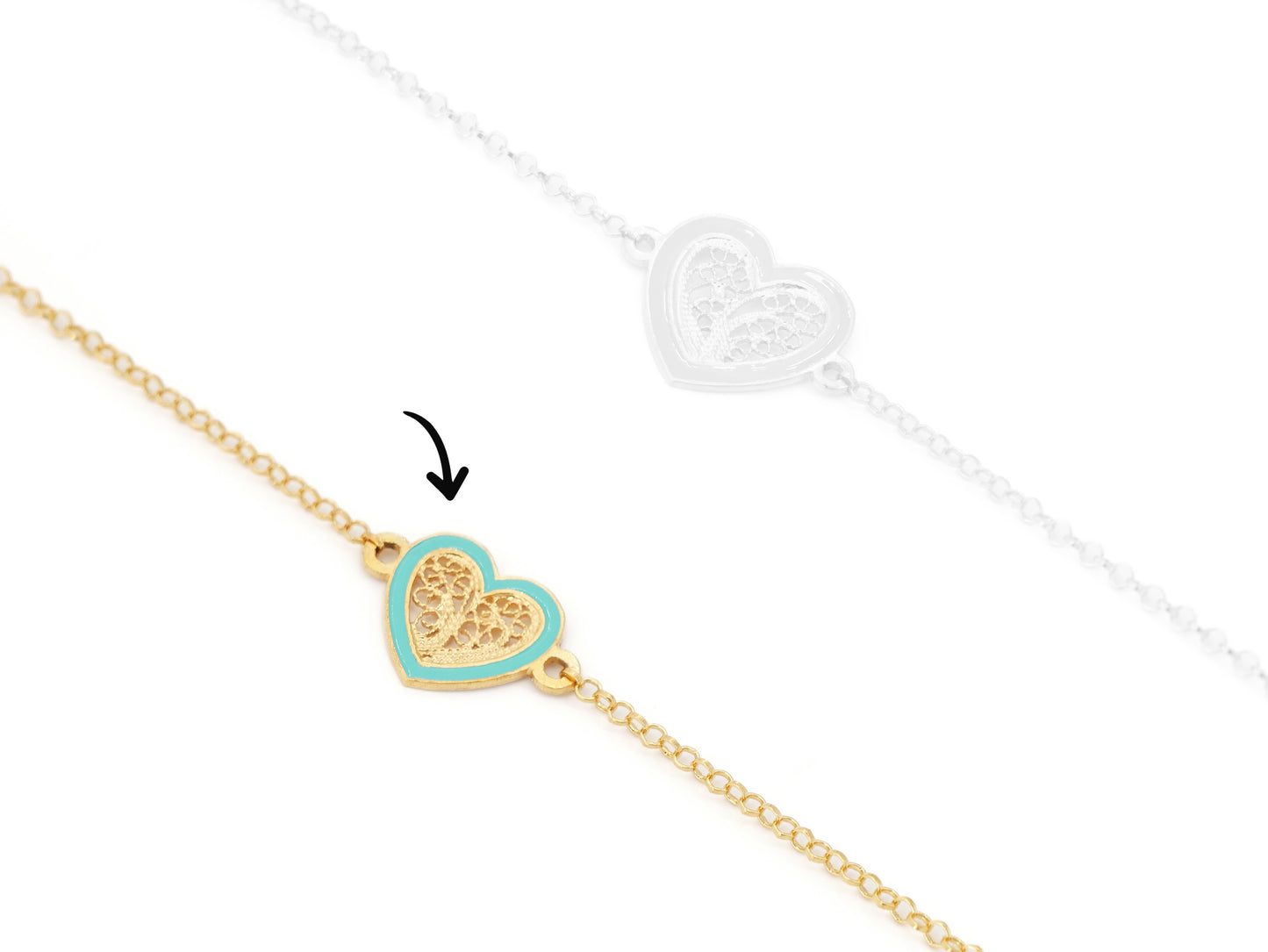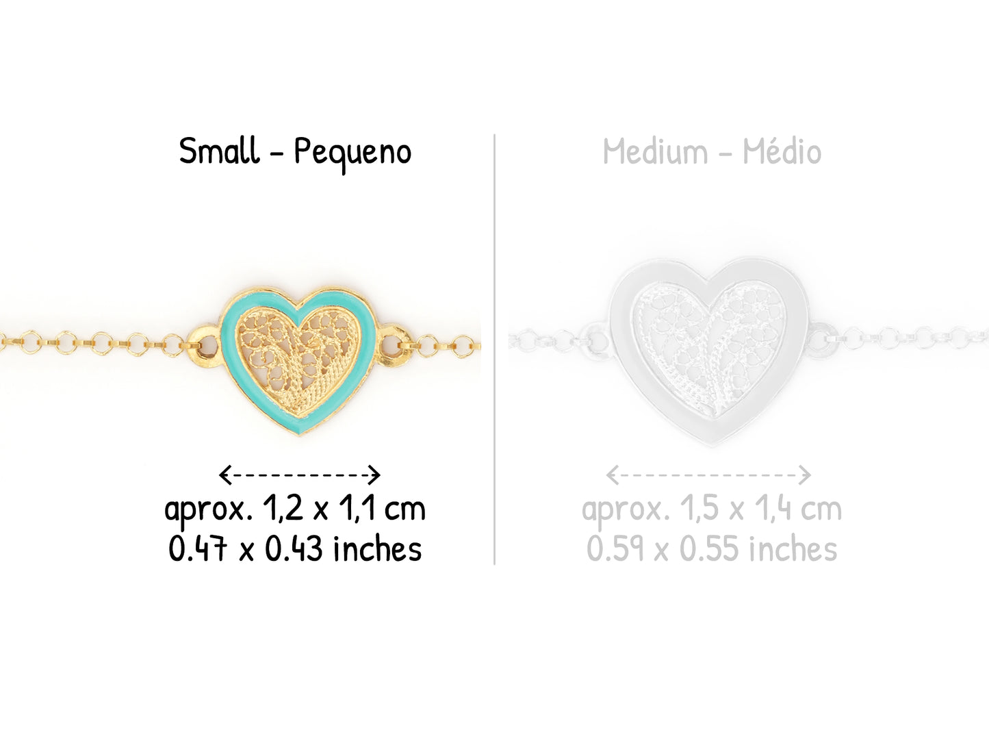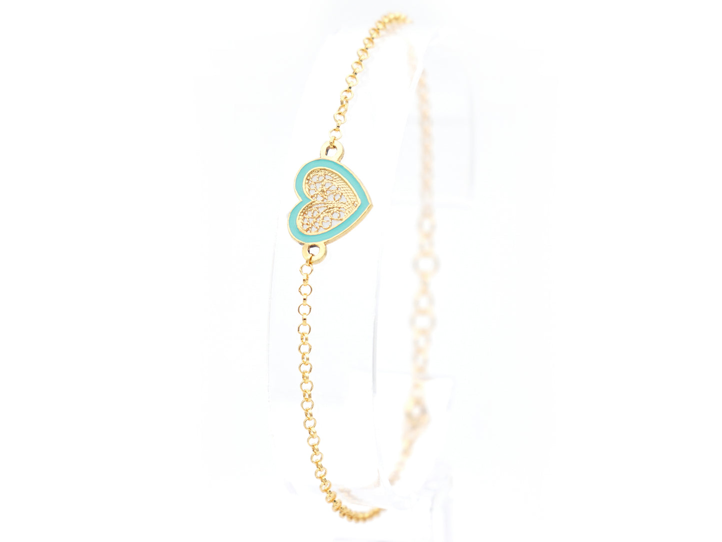 Elegant Small Heart Bracelet with Turquoise Enamel. Portuguese Filigree, crafted in Portugal in Golden 925 Sterling Silver.
