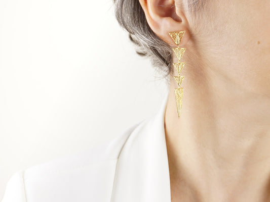 Boucles d'Oreilles Longues aux Triangles, Filigrane Portugaise, Argent 925 Doré