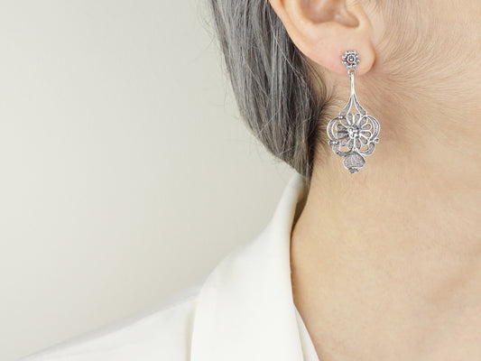 Boucles d’Oreilles Fleurs Grandes Inversées, Filigrane Portugaise, Argent 925