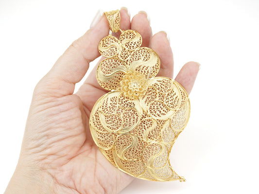 Médaille Coeur Traditionel Extra Large, Filigrane Portugaise, Argent 925 Doré