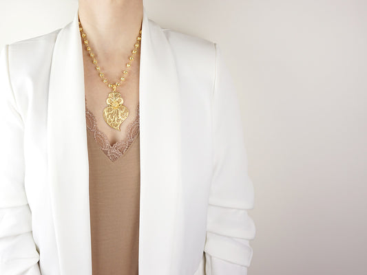 Collier Perles de Viana avec Coeur de Viana, Filigrane Portugaise, Argent 925 Doré