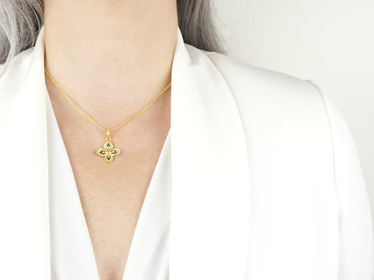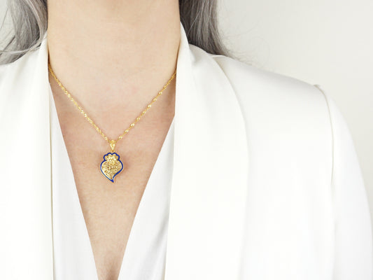 Collier Fleur Classique Émaillé en Bleu, Filigrane Portugaise, Argent 925 Doré