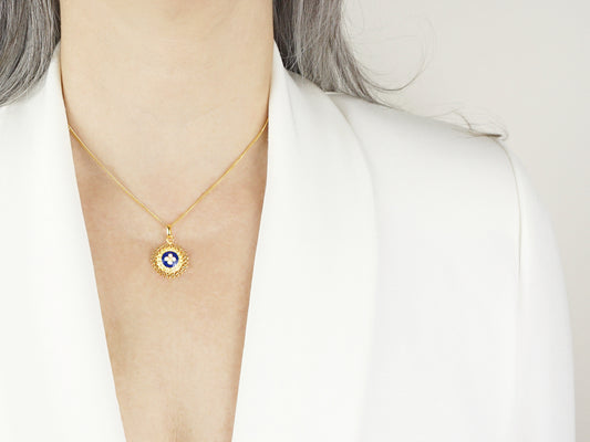 Collier avec Ovale à Fleur Émailé en Bleu, Filigrane Portugaise, Argent 925 Doré