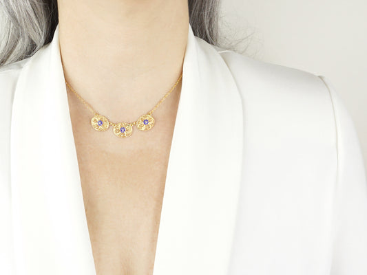 Collier avec Trois Ovales aux Fleurs Émailés en Bleu, Filigrane Portugaise, Argent 925 Doré