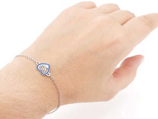 Bracelet au Petit Coeur Émail Bleu, Filigrane Portugaise, Argent 925 Rhodié