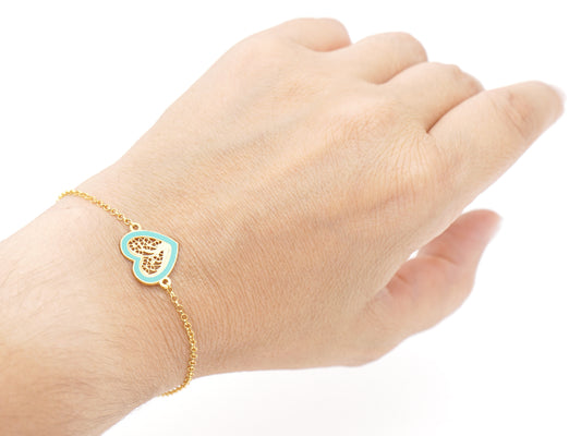 Bracelet au Coeur Moyen Émail Turquoise, Filigrane Portugaise, Argent 925 Doré