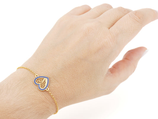 Bracelet au Coeur Moyen Émail Bleu, Filigrane Portugaise, Argent 925 Doré