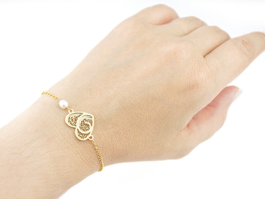 Bracelet Coeur et Perle, Filigrane Portugaise, Argent 925 Doré