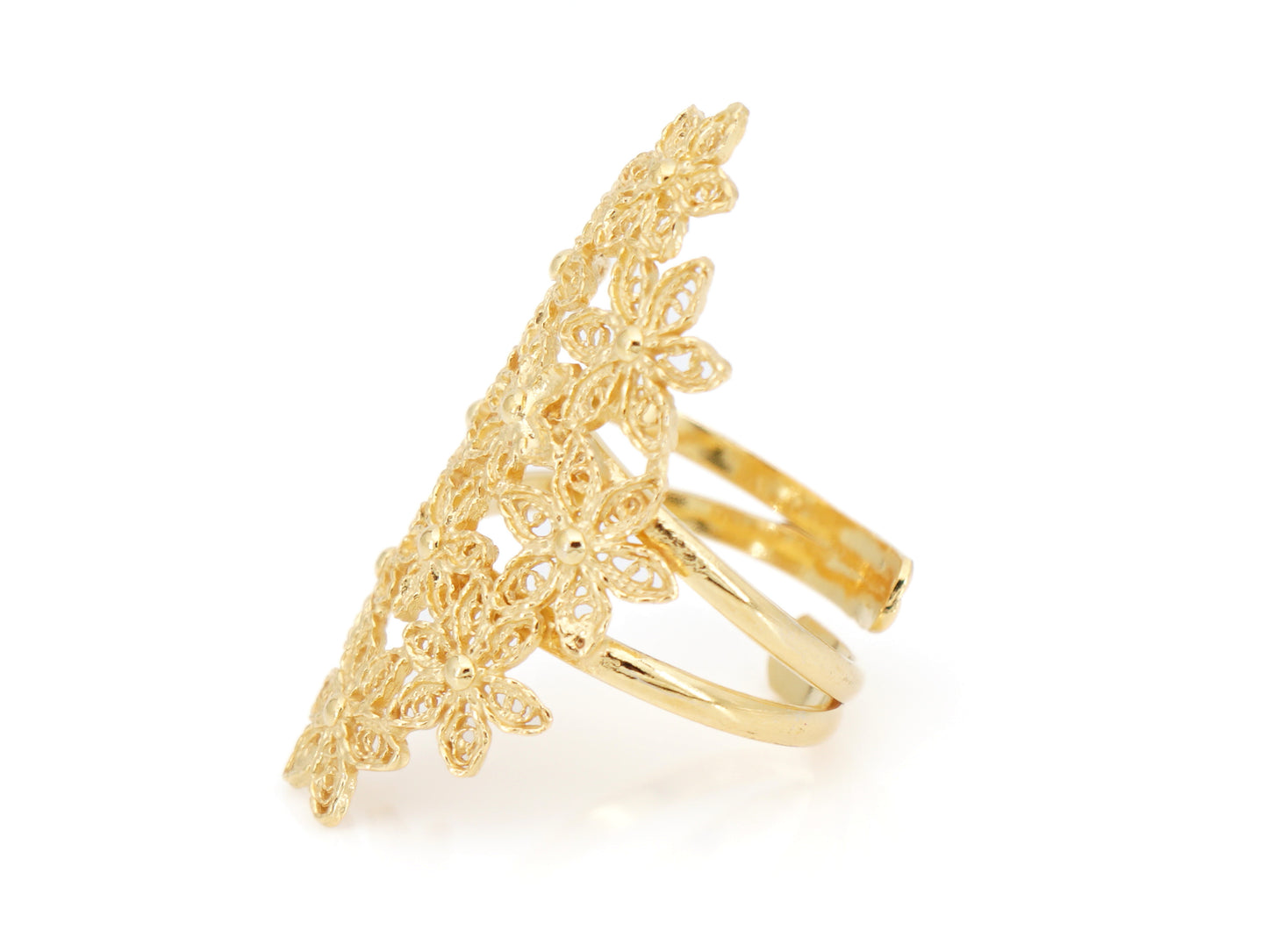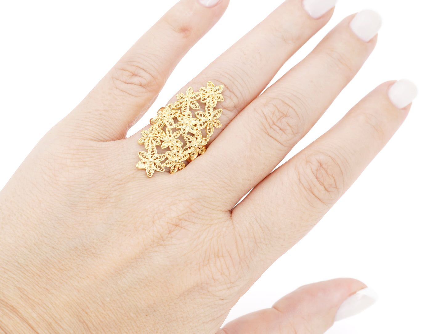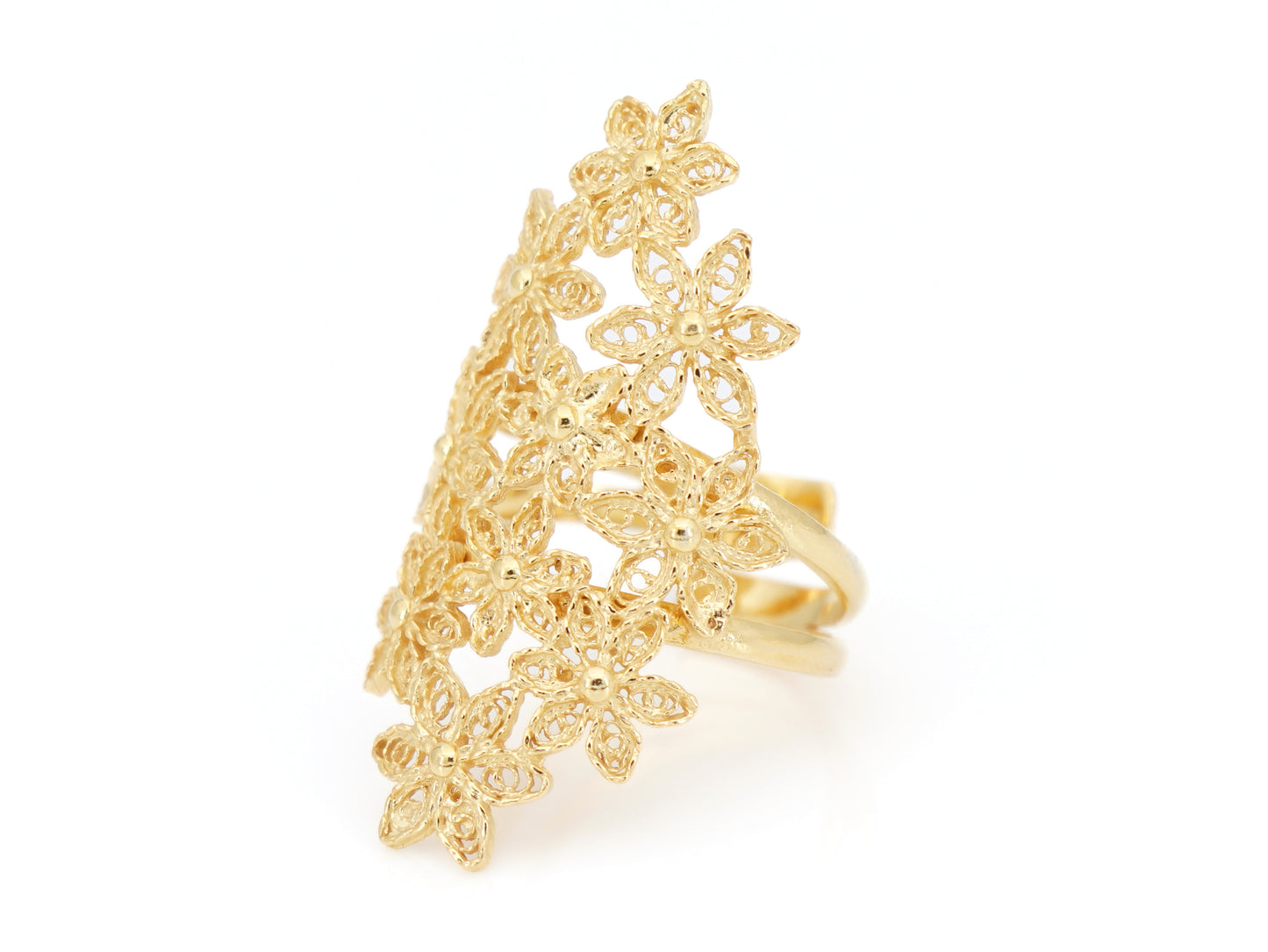 Elégante Bague Longue aux Petites Fleurs, de taille réglable. Filigrane Portugaise, fabriqué au Portugal en Argent 925 Doré.