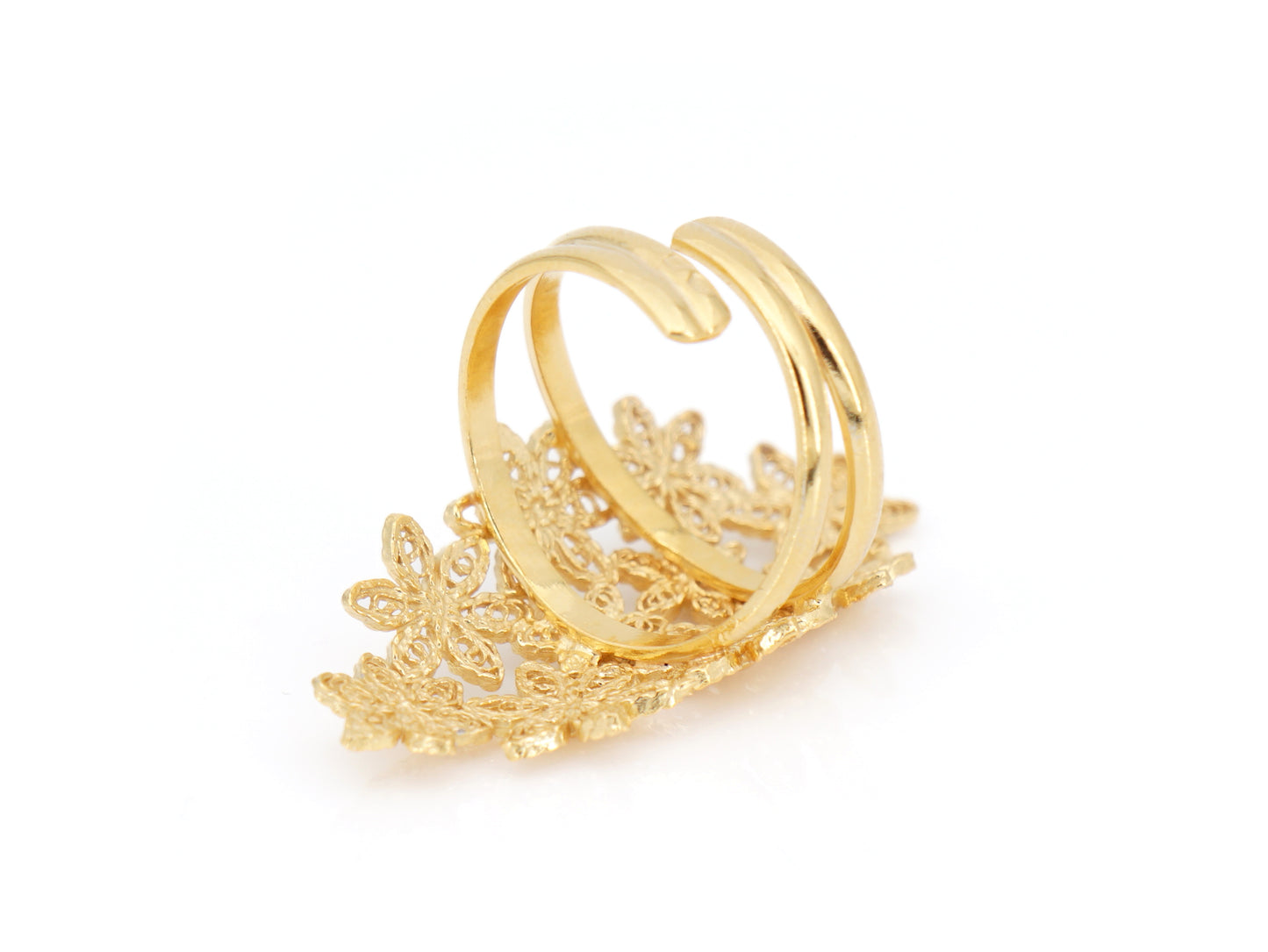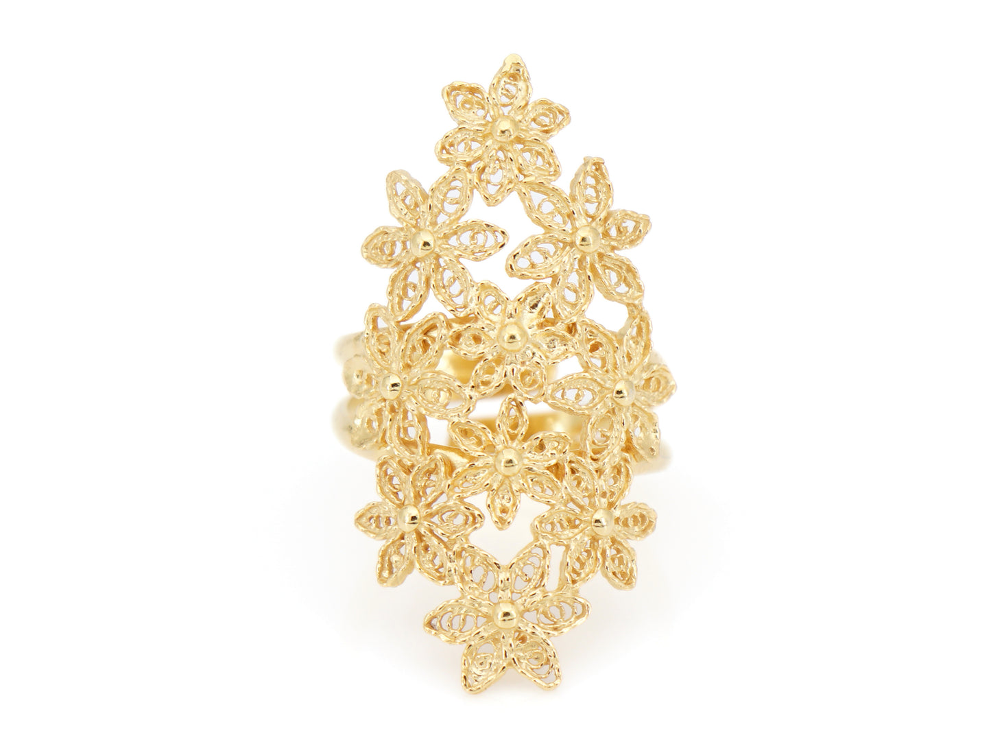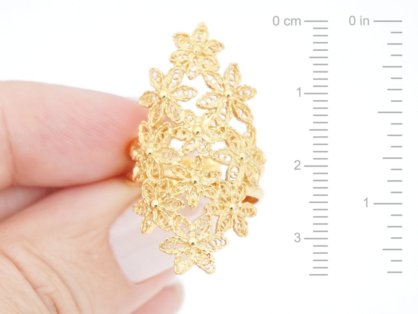 Elégante Bague Longue aux Petites Fleurs, de taille réglable. Filigrane Portugaise, fabriqué au Portugal en Argent 925 Doré.