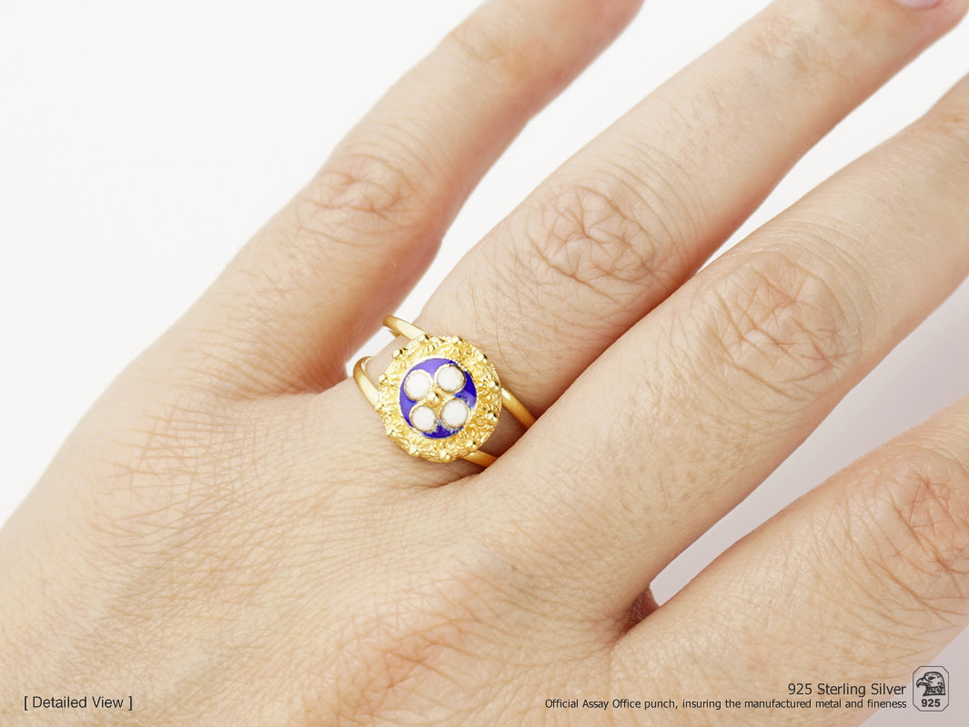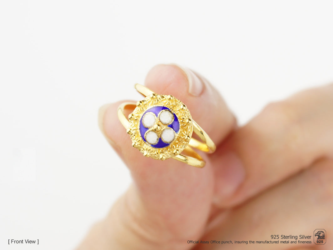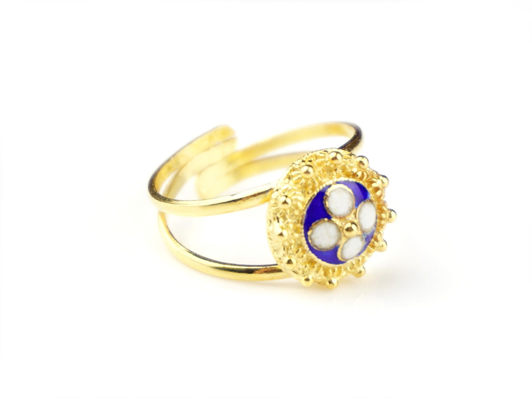 Élégante Bague Caramujo Classique réglable Émailé en Bleu et Blanc. Filigrane Portugaise, fabriqué au Portugal en Argent 925 Doré.