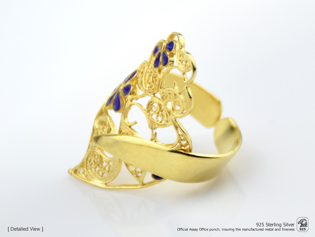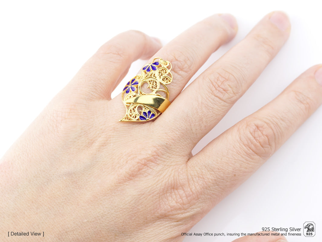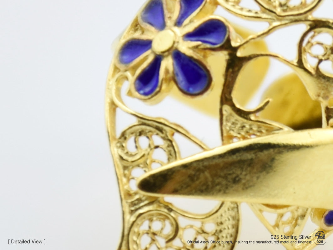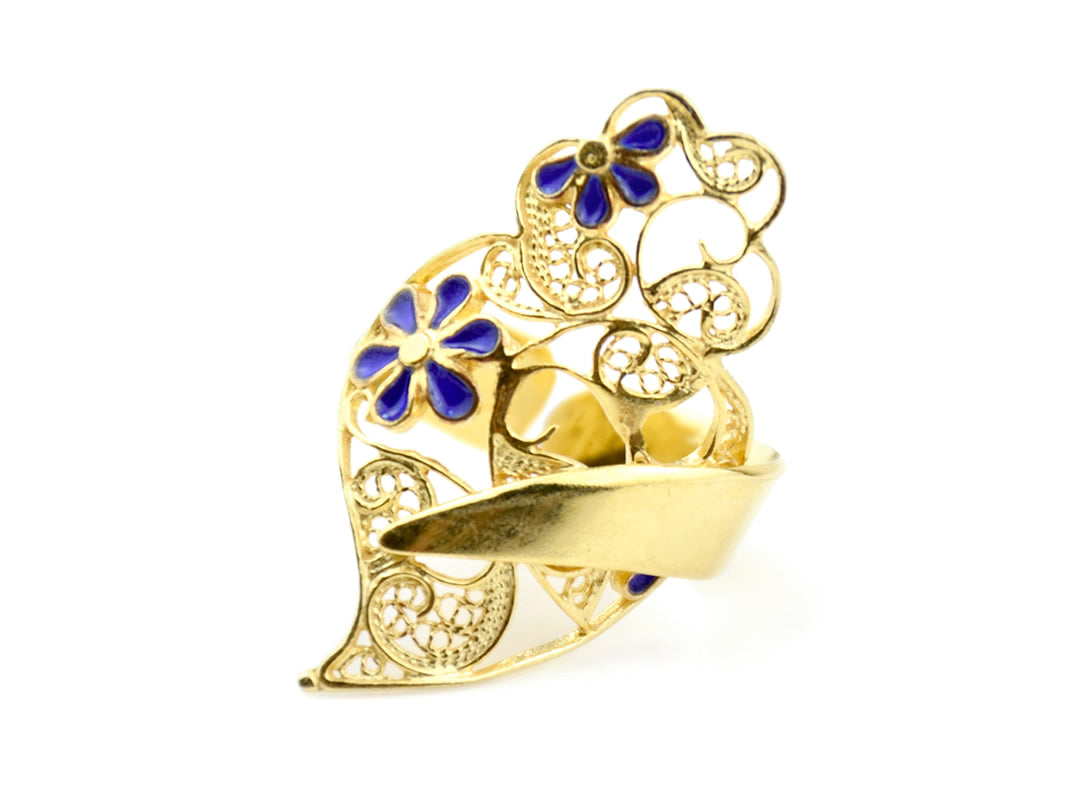 Bague Réglable Coeur aux Fleurs Émaillées, Filigrane Portugaise, Argent 925 Doré