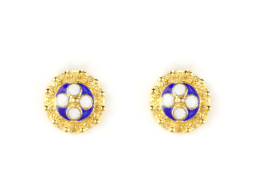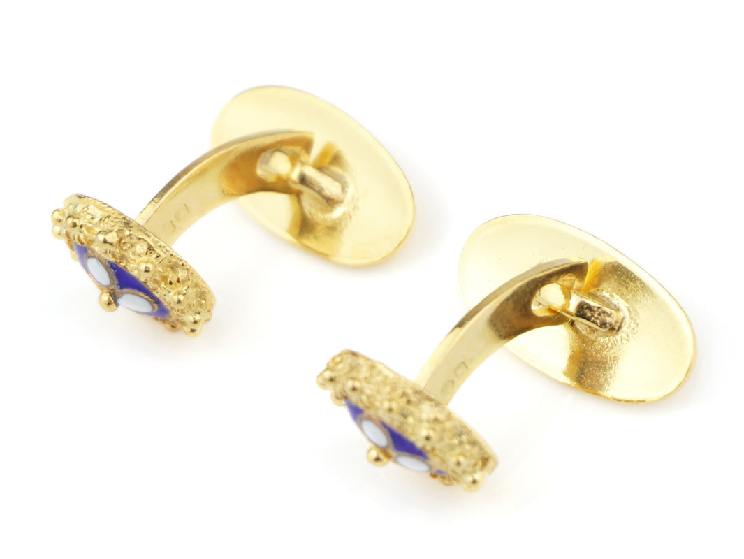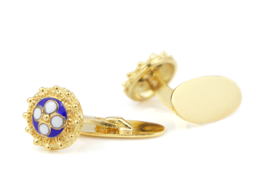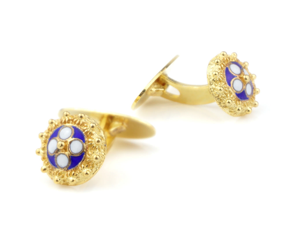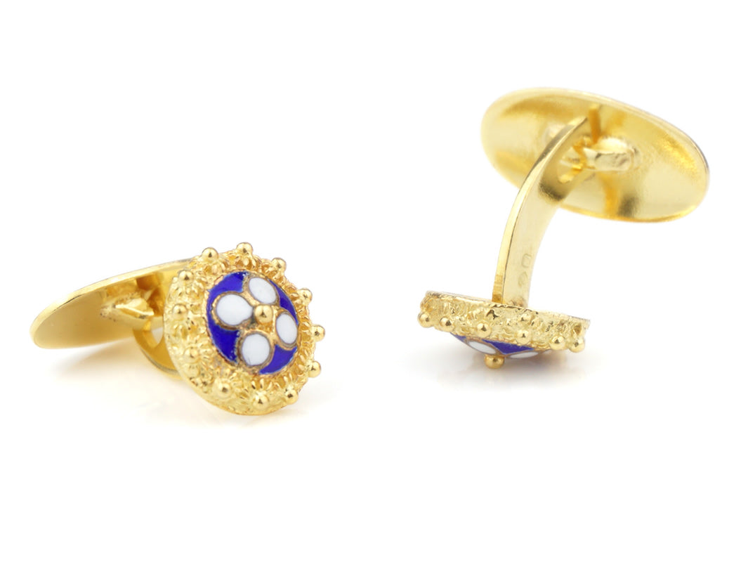 Élégantes Boutons de manchette Caramujos classiques avec émail bleu. Filigrane Portugaise, fabriqué au Portugal en Argent 925 Doré.