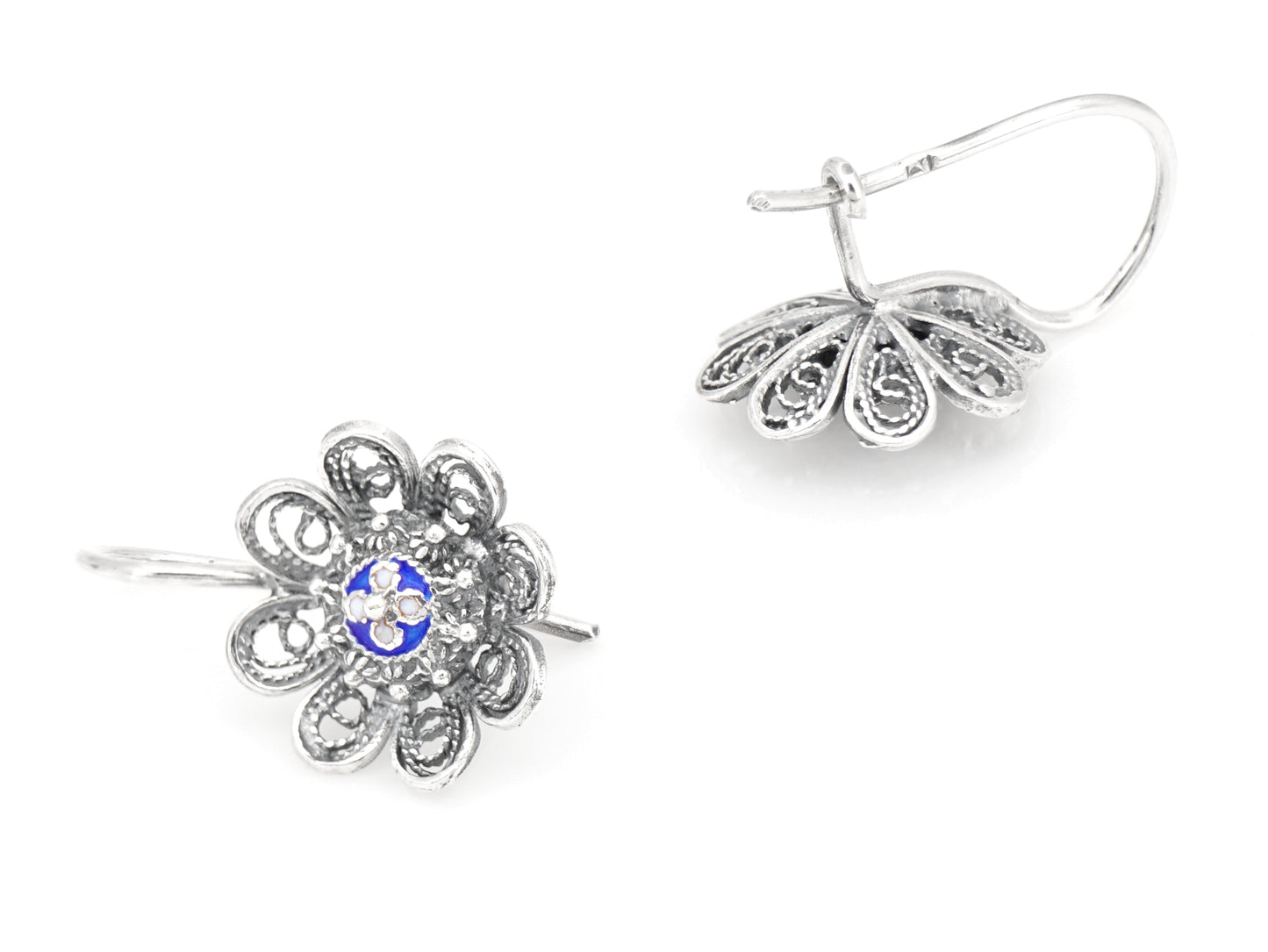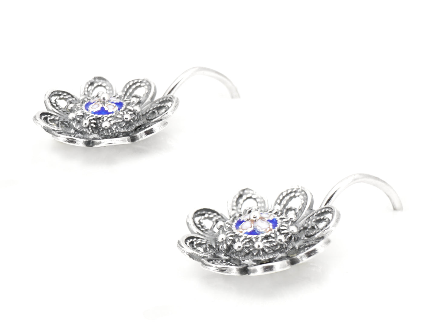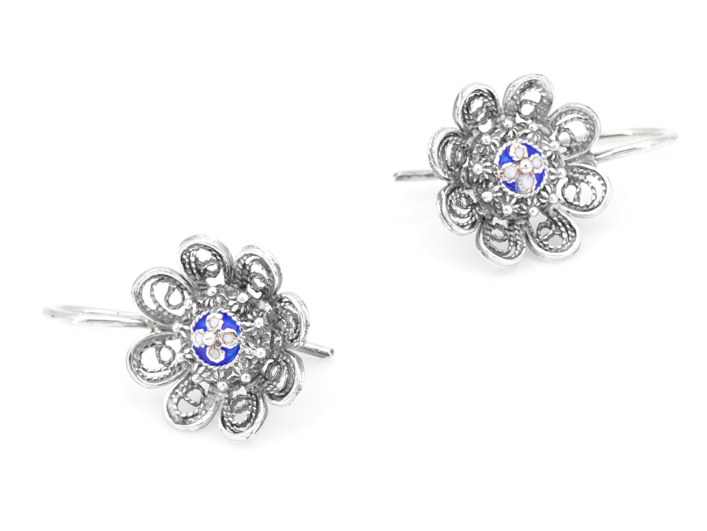 Élégantes Boucles d'Oreilles Fleurs avec Caramujos Émaillés en Bleu, fermoir à crochet. Filigrane Portugaise, fabriqué au Portugal en Argent 925.