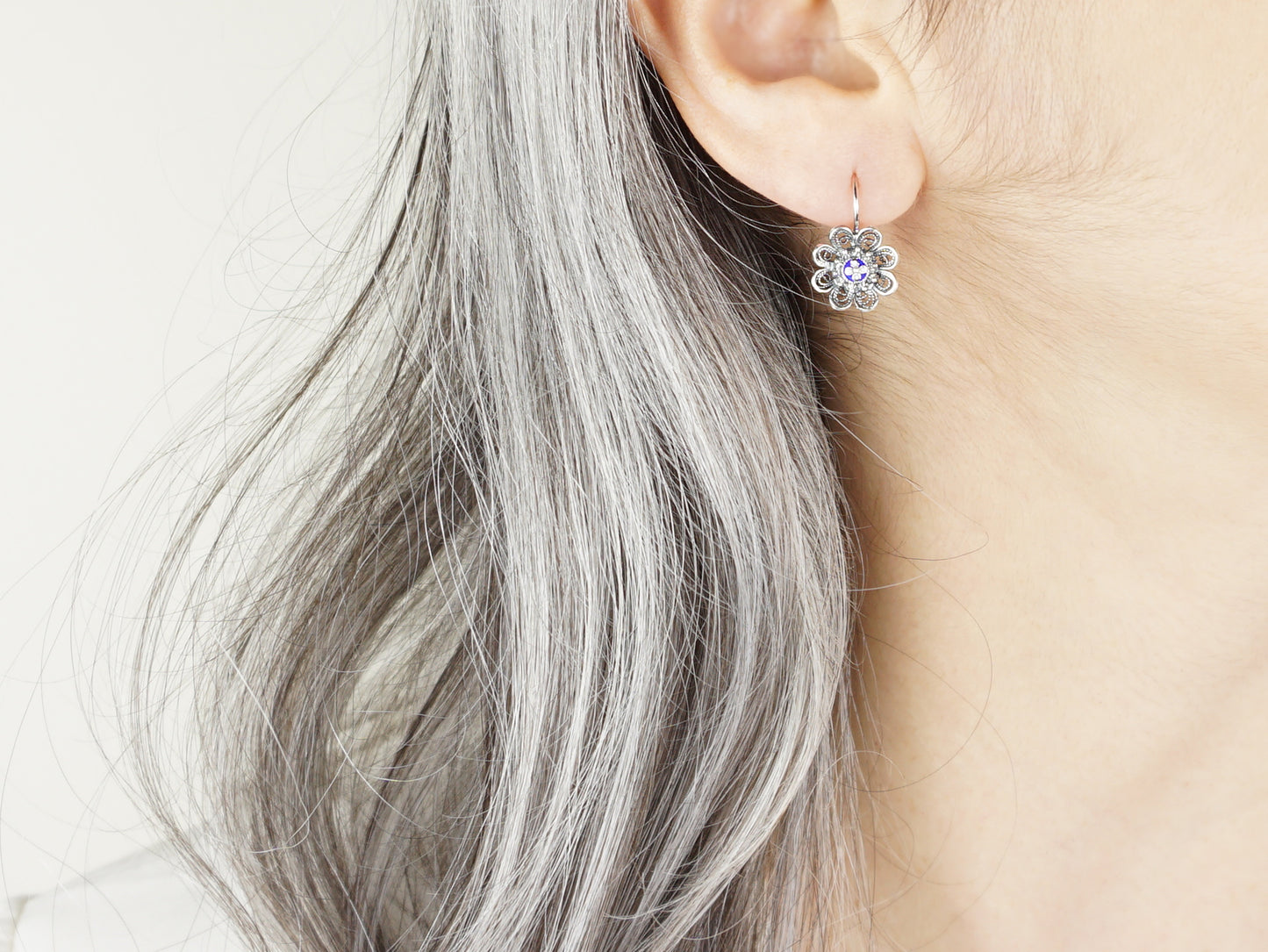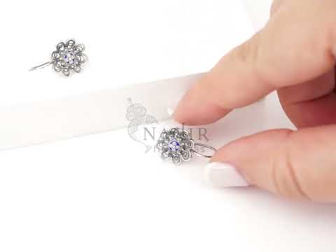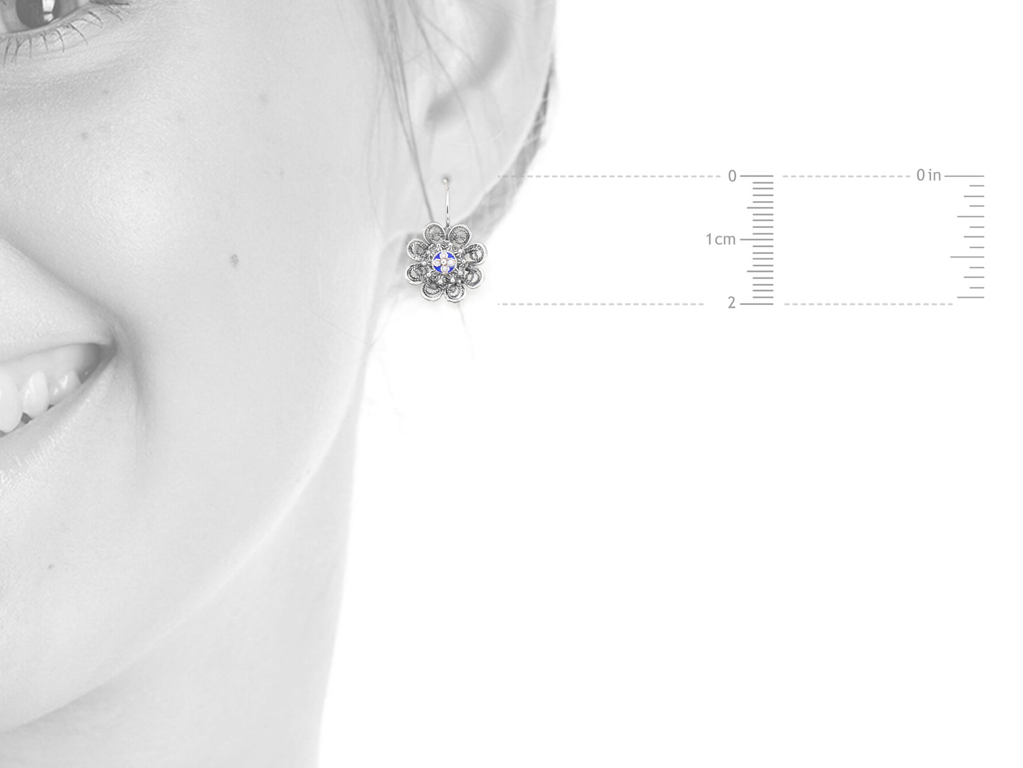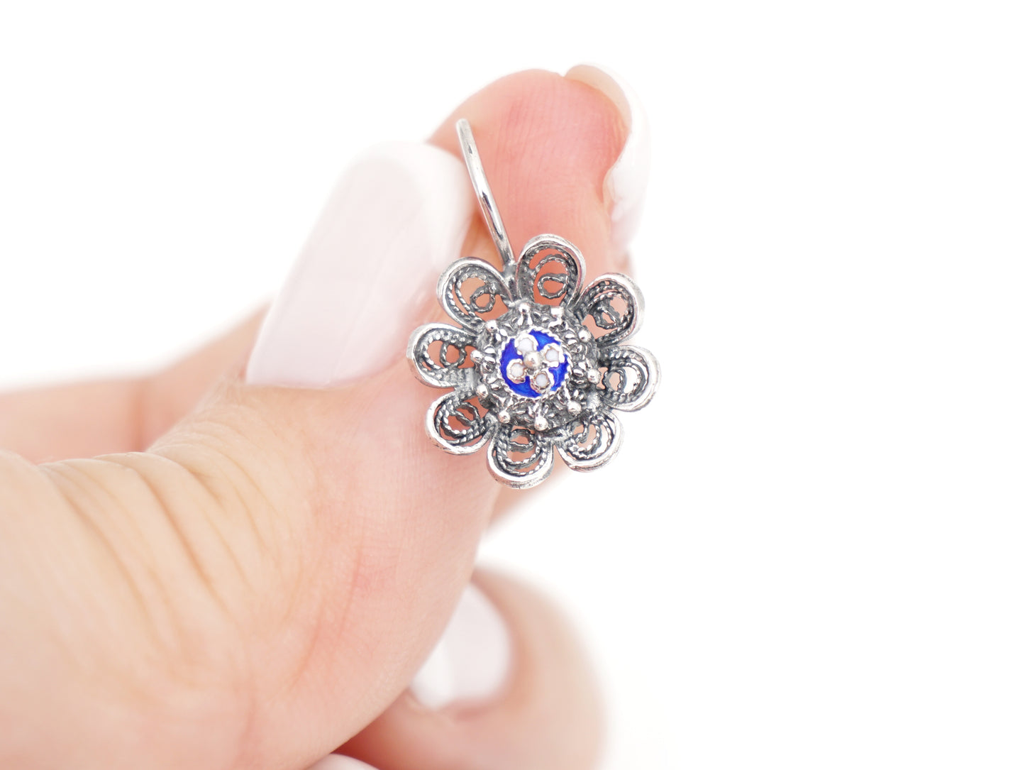 Élégantes Boucles d'Oreilles Fleurs avec Caramujos Émaillés en Bleu, fermoir à crochet. Filigrane Portugaise, fabriqué au Portugal en Argent 925.