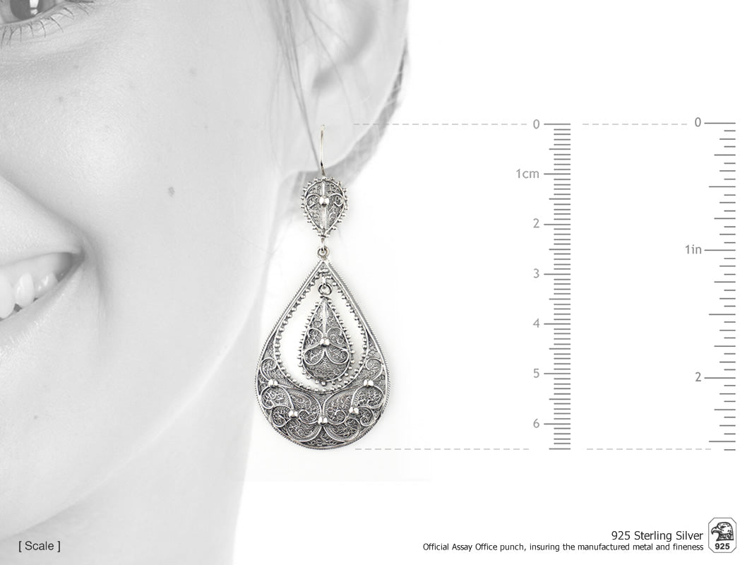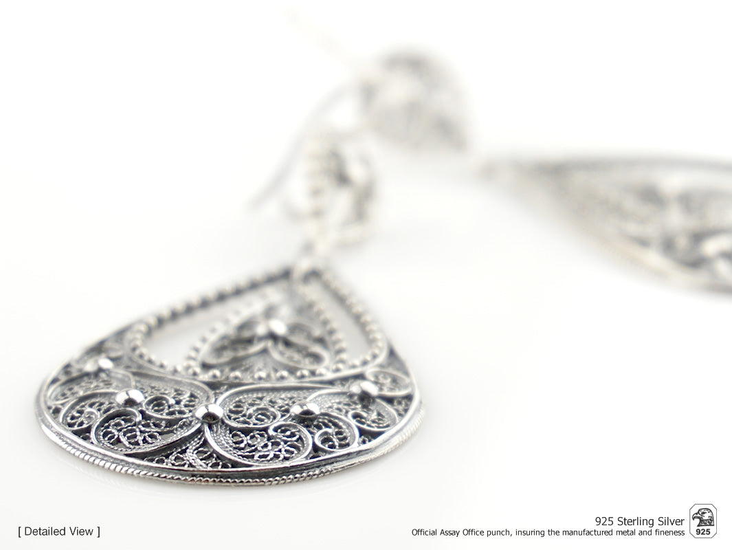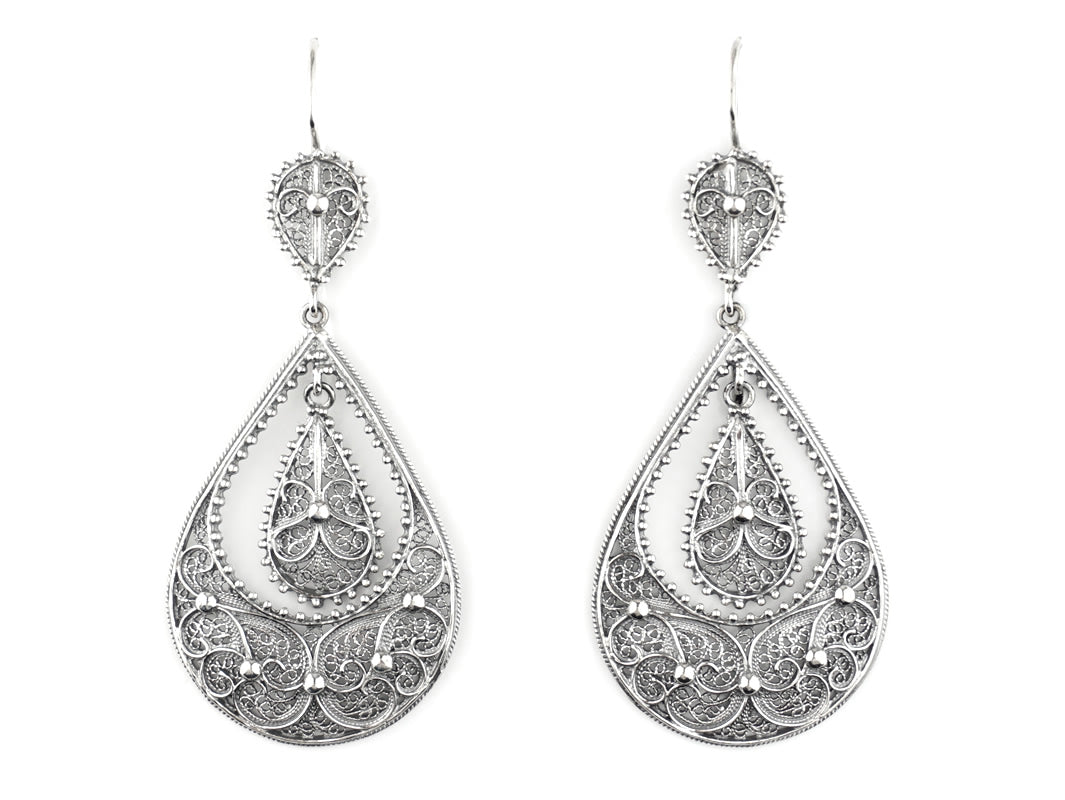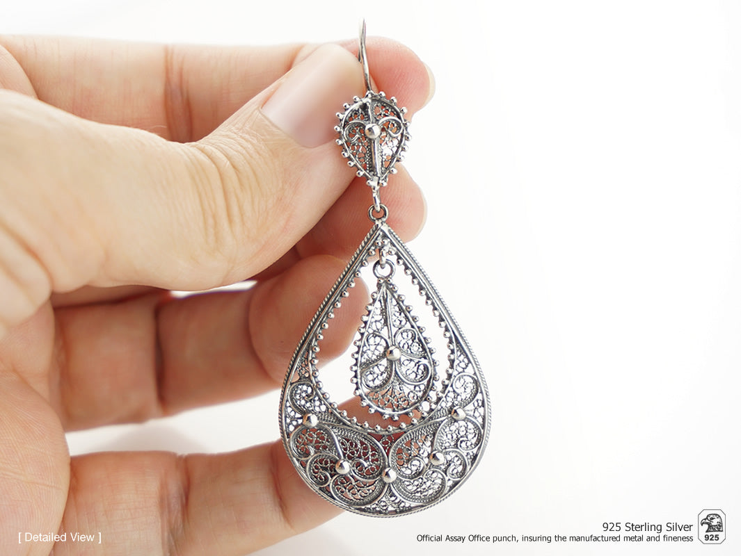 Boucles d'Oreilles Goutes Larges, Filigrane Portugaise, Argent 925