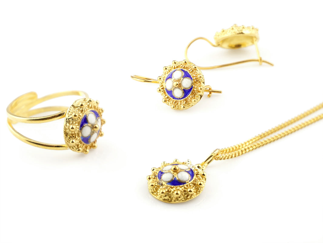 Élégante parure Caramujo Classique composé de Boucles d'Oreilles, Bague et Collier, Émaillées en Bleu et Blanc. Filigrane Portugaise, fabriqué au Portugal en Argent 925 Doré.