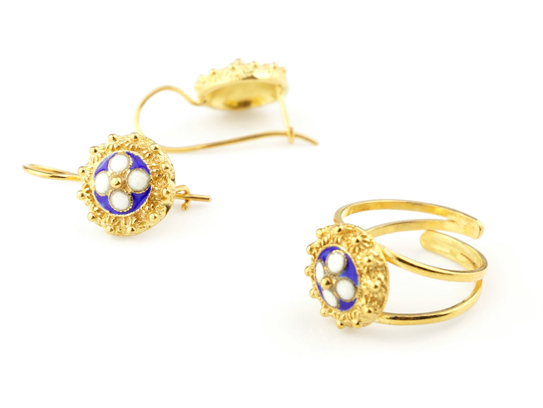 Élégante parure Caramujos Classiques composé de Boucles d'Oreilles et Bague réglable, Émaillées en Bleu et Blanc. Filigrane Portugaise, fabriqué au Portugal en Argent 925 Doré.