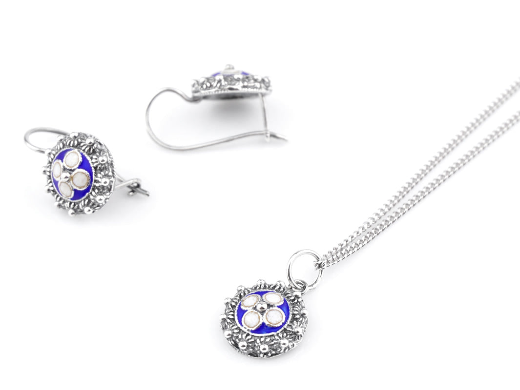 Élégante parure Caramujo Classique composé de Boucles d'Oreilles et Collier avec chaine courte réglable, Émailées en Bleu et Blanc. Filigrane Portugaise, fabriqué au Portugal en Argent 925.
