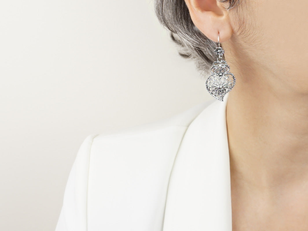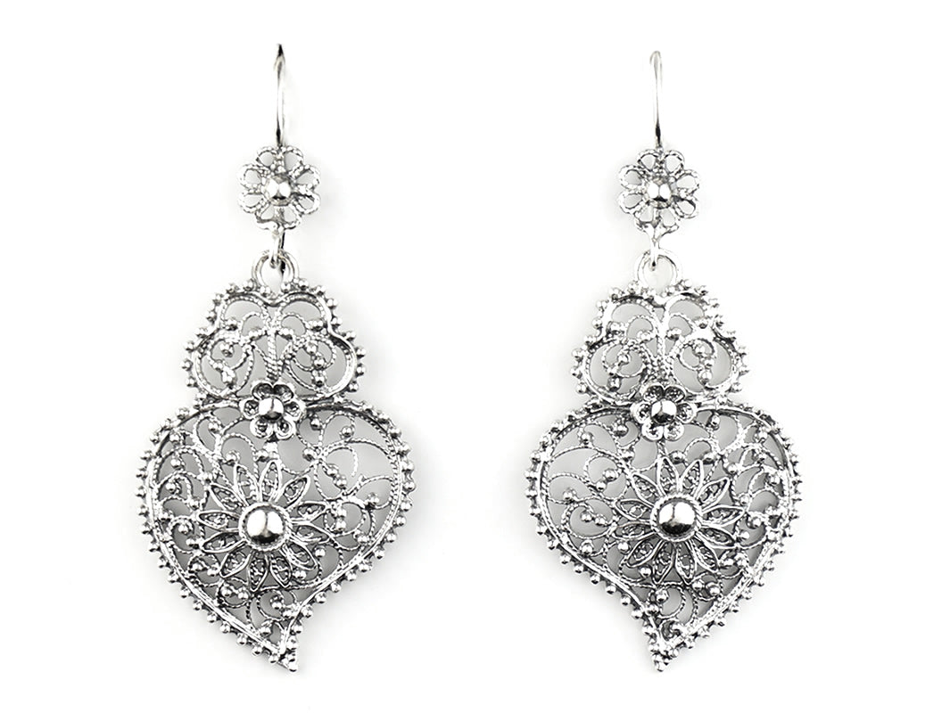 Élégante parure composé de Boucles d'Oreilles Coeur Fidalga Moyennes et Collier avec large Cour Dentelle. Filigrane Portugaise, fabriqué au Portugal en Argent 925.