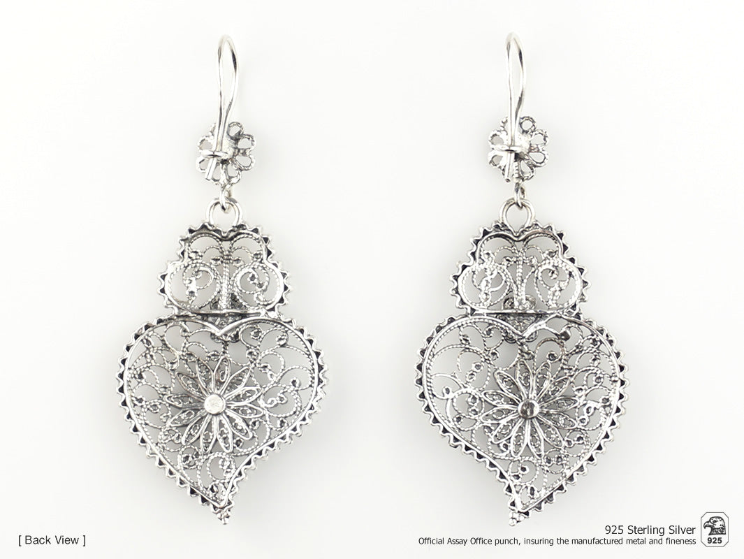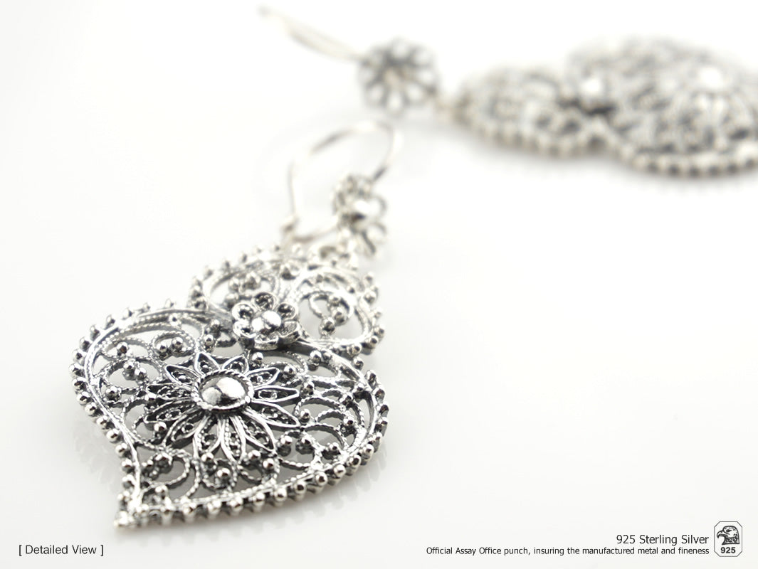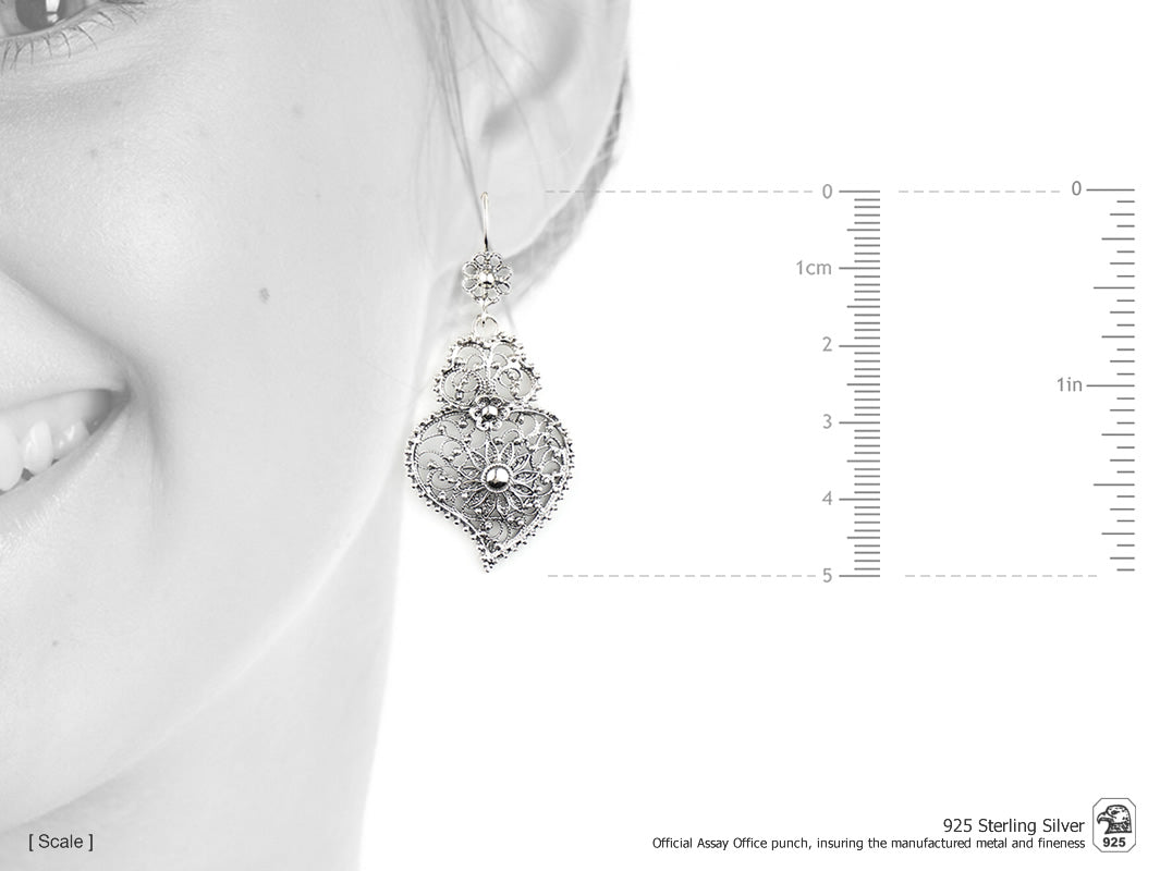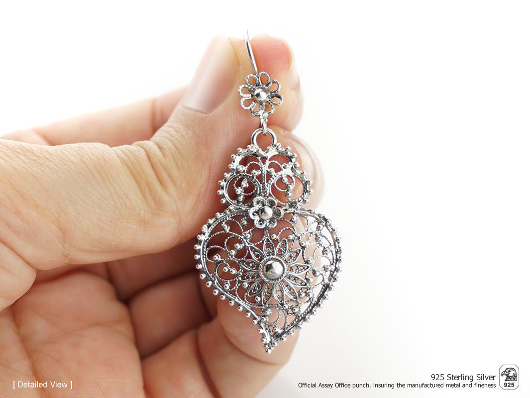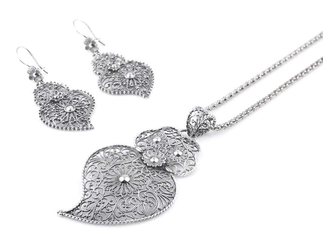 Parure Boucles D'Oreilles Coeur Fidalga Moyennes et Collier avec Cour Dentelle, Filigrane Portugaise, Argent 925.