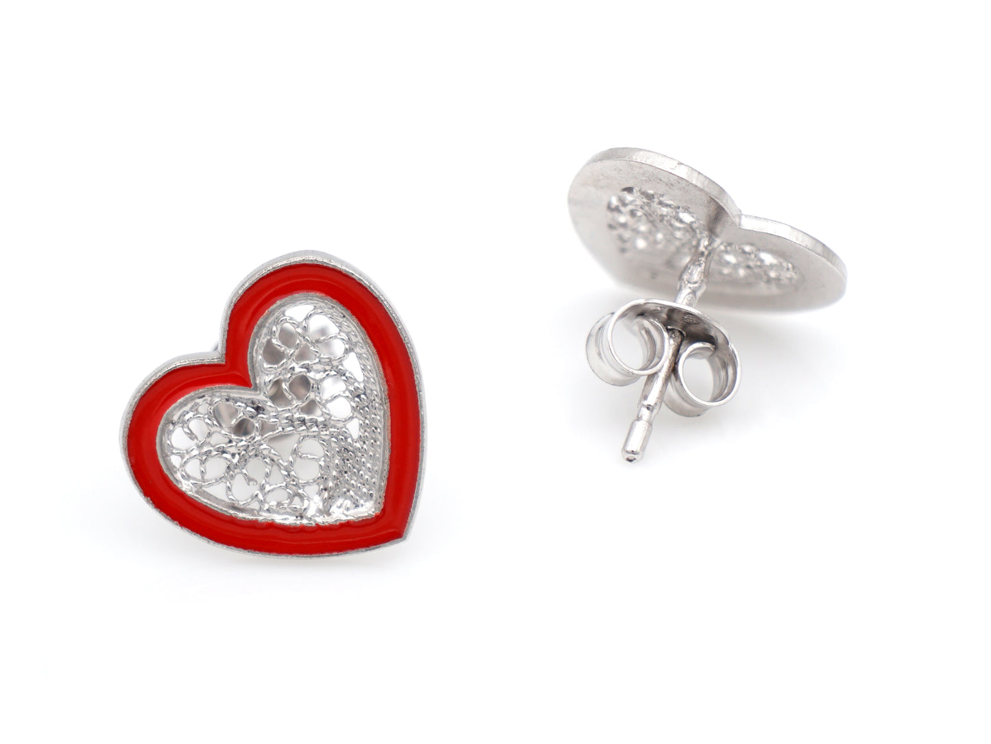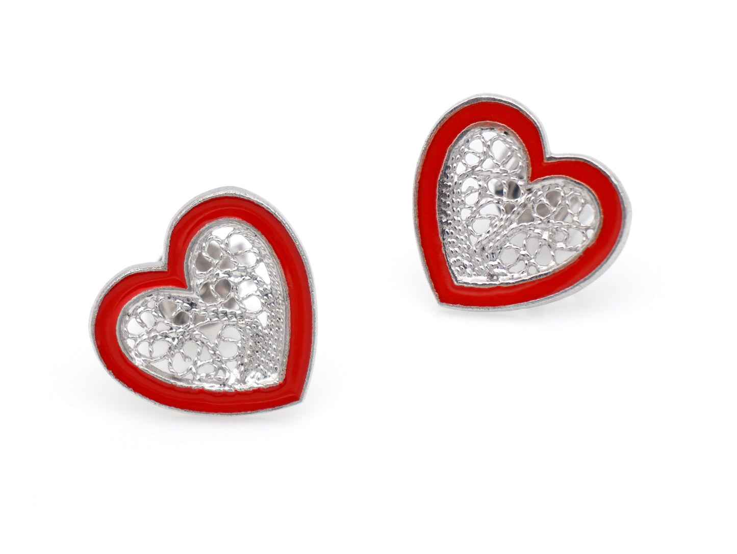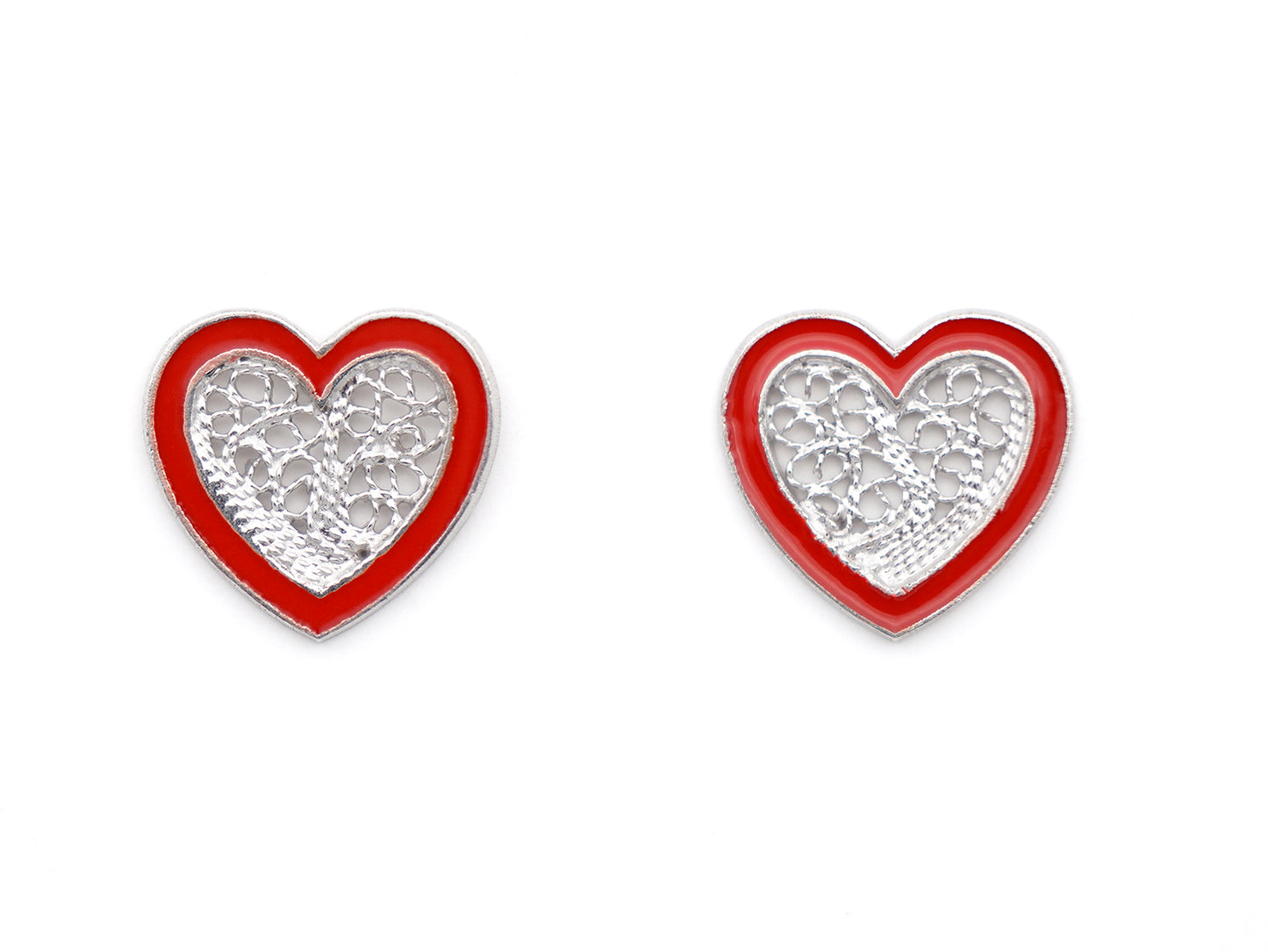 Elégante Parure "Petits Coeurs Émaillés en Rouge" de Boucles d'Oreilles à poussette et Collier réglable. Filigrane Portugaise, fabriqué au Portugal en Argent 925 Rhodié.