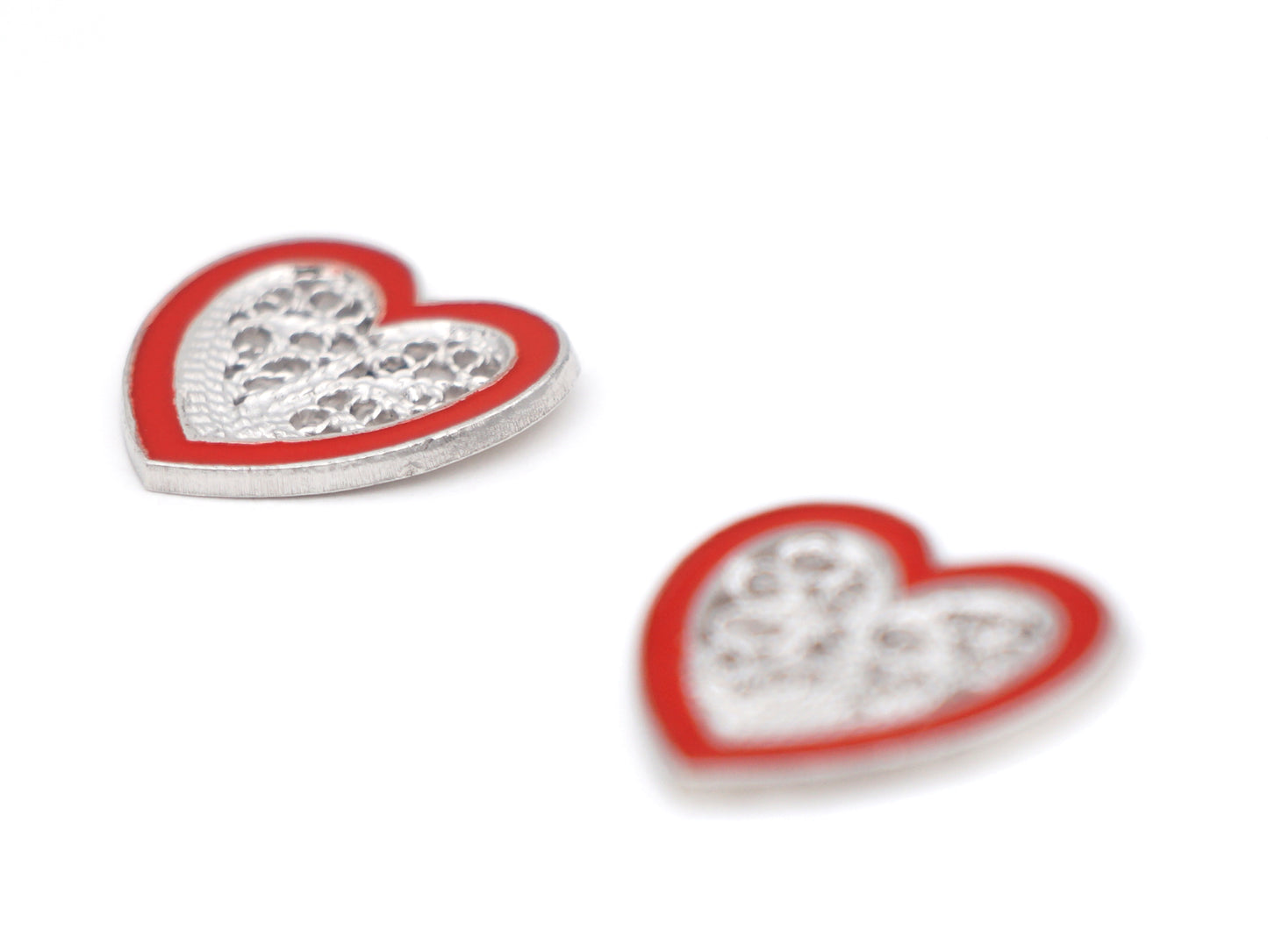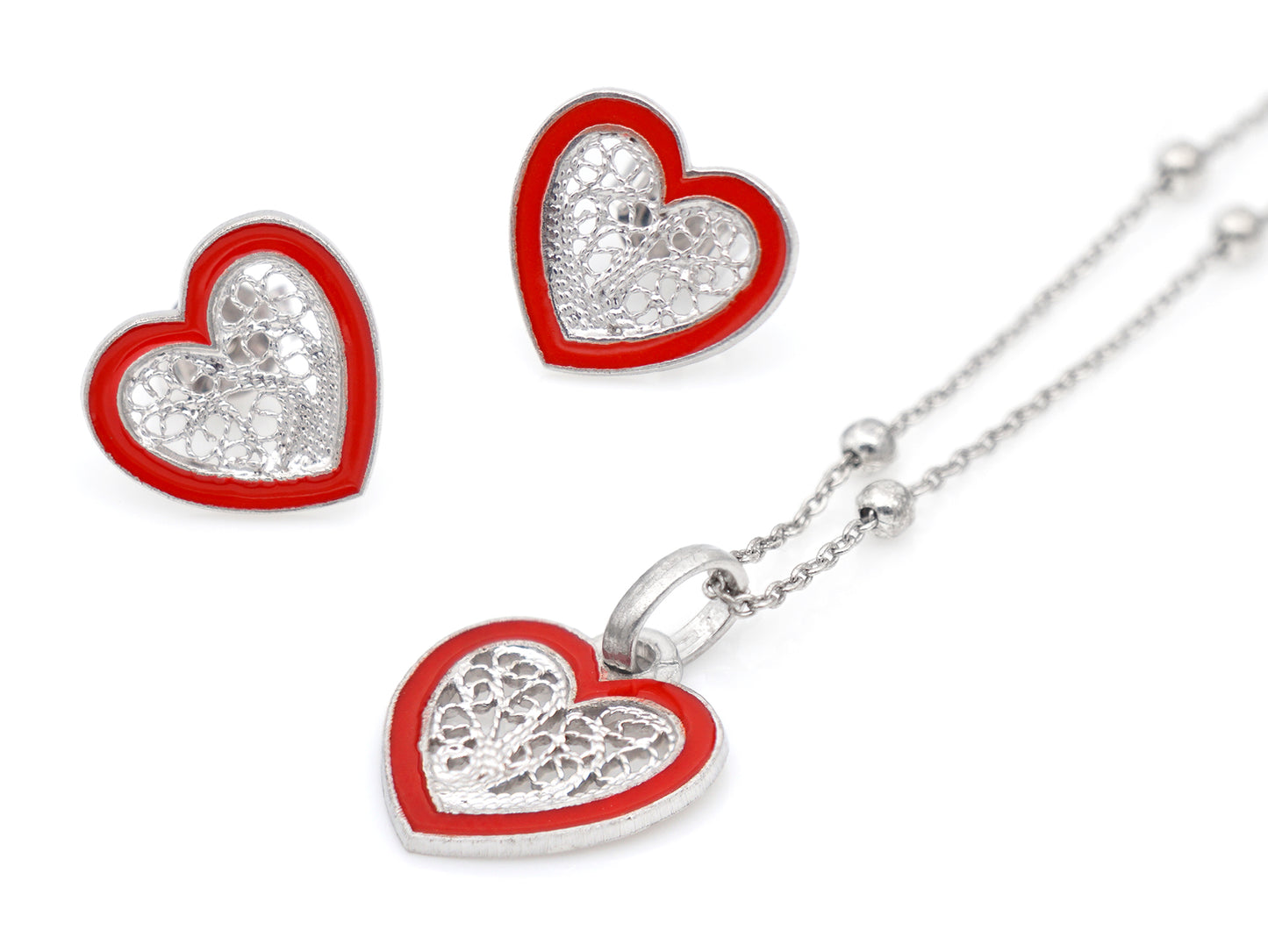 Parure Petits Coeurs Émaillés en Rouge, Boucles d'Oreilles et Collier, Filigrane Portugaise, Argent 925 Rhodié