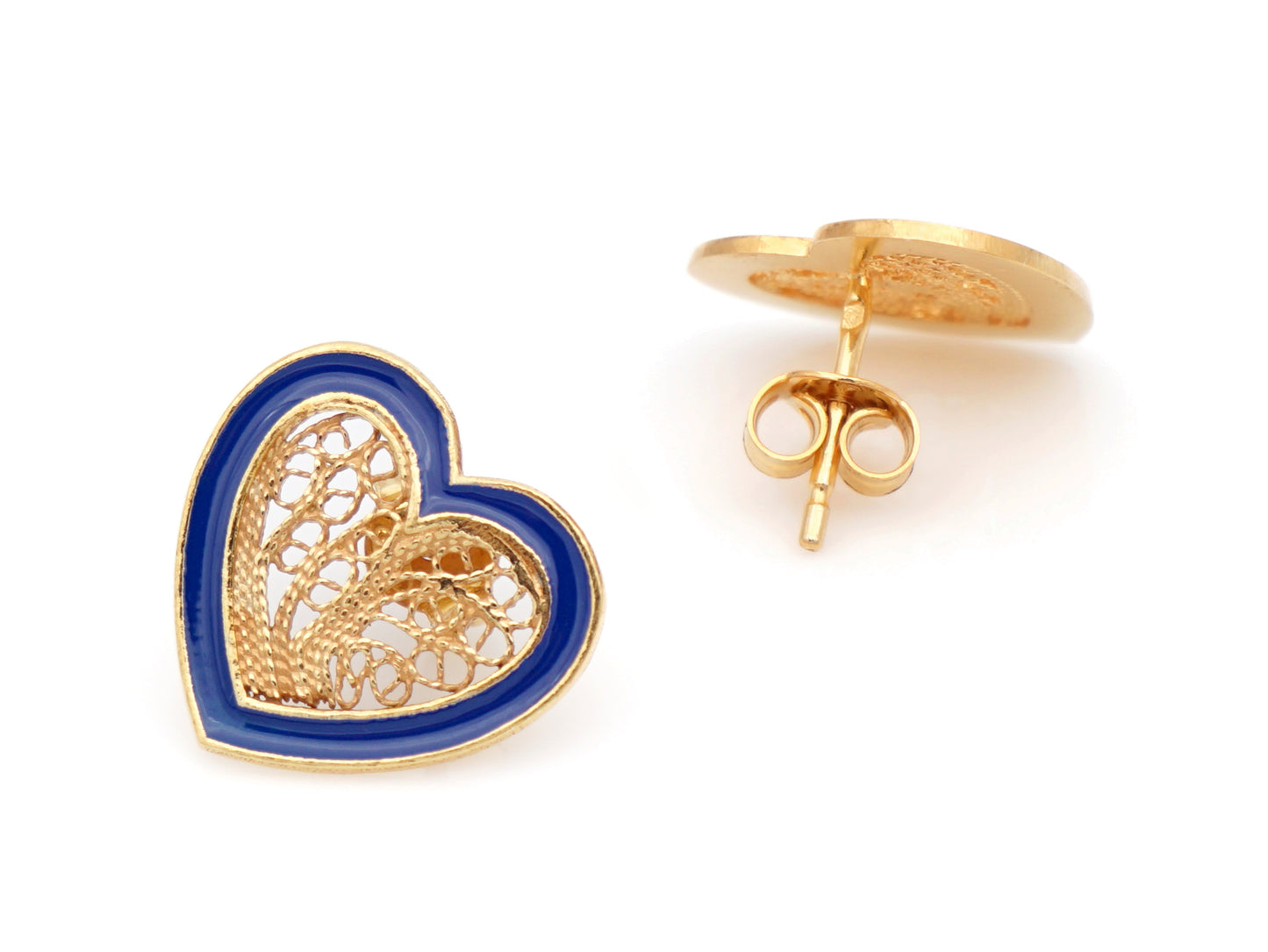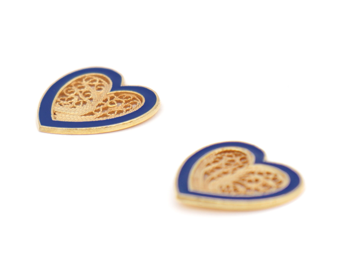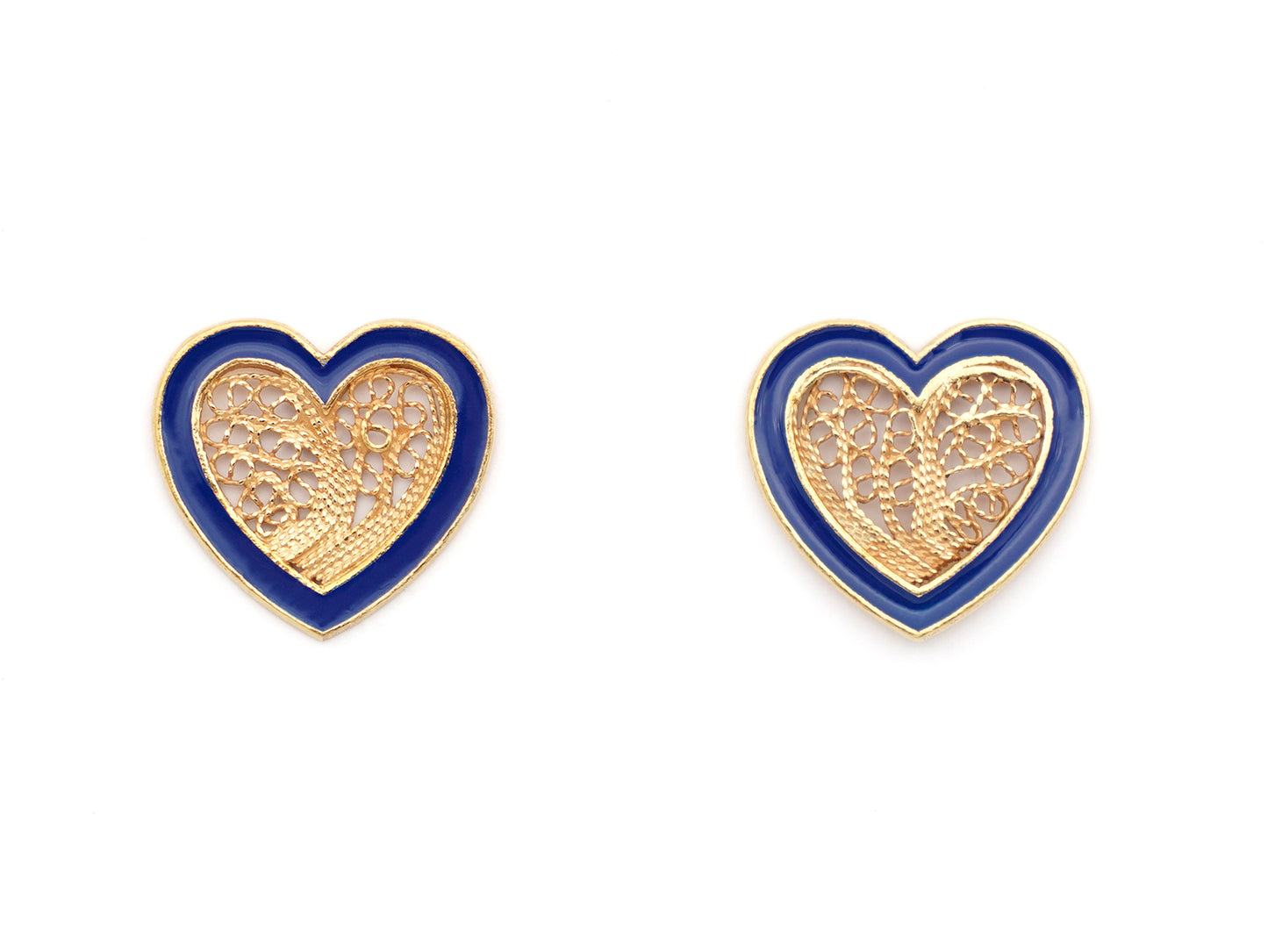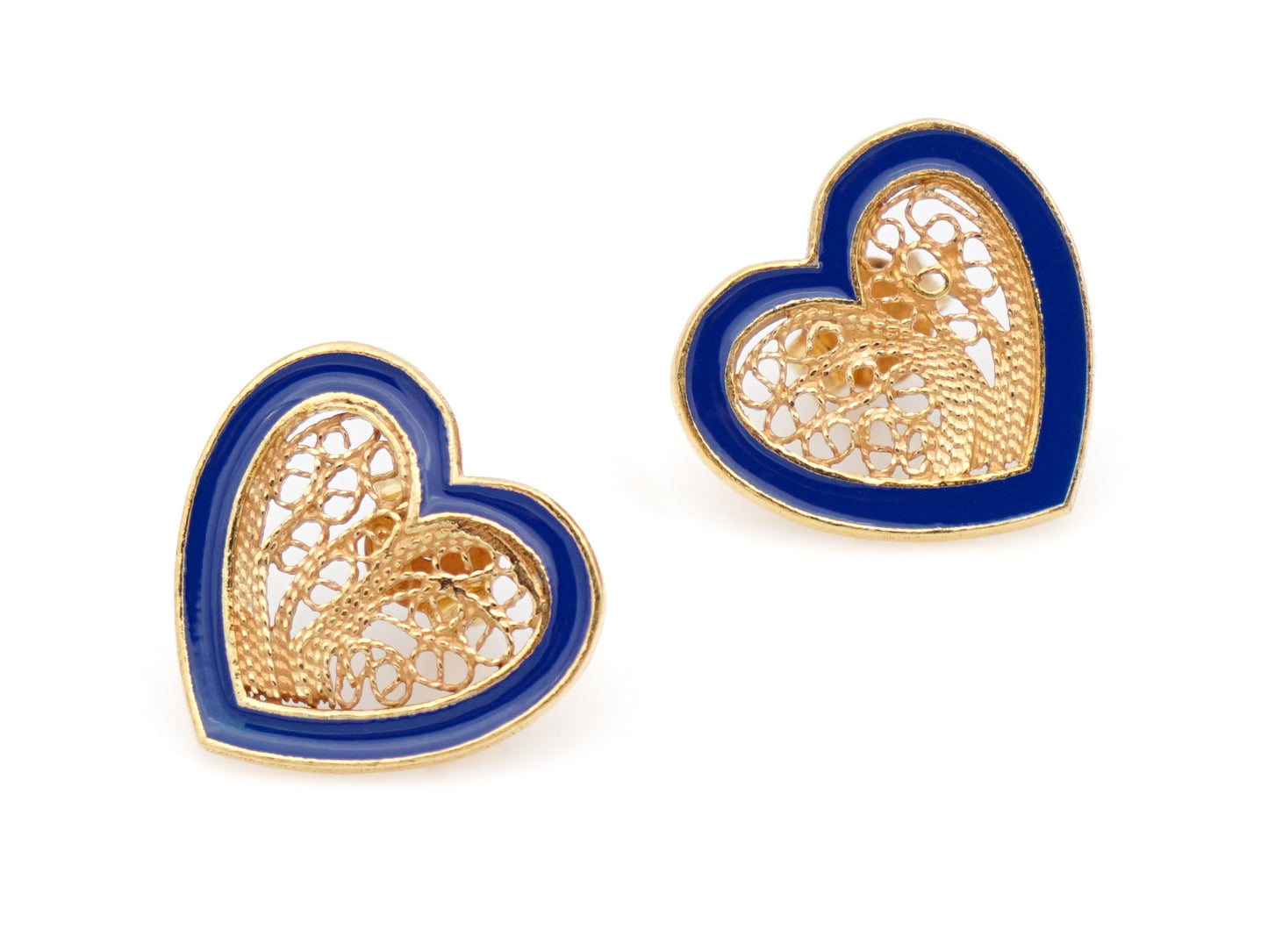 Elégantes Boucles d'Oreilles Coeurs Moyens avec Émail Bleu, fermeture poussette. Filigrane Portugaise, fabriqué au Portugal en Argent 925 Doré.
