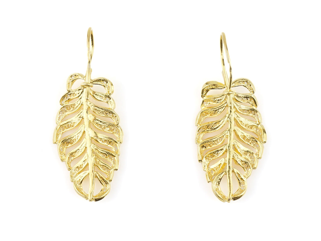 Élégantes Boucles d'Oreilles Feuilles pendentes moyennes, crochets. Filigrane Portugaise, fabriqué au Portugal en Argent 925 Doré.