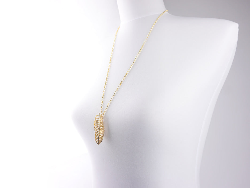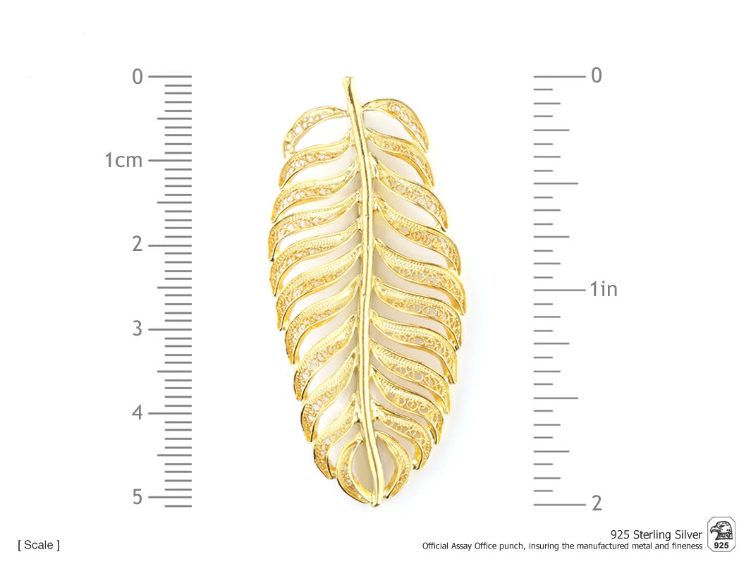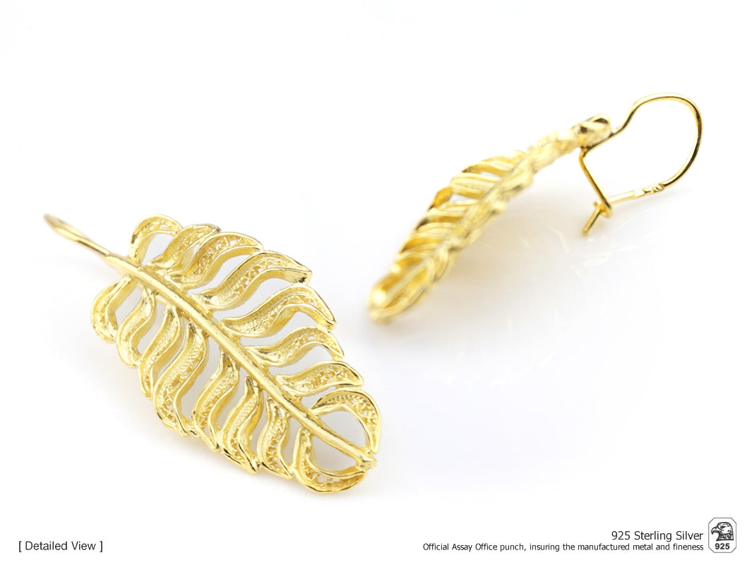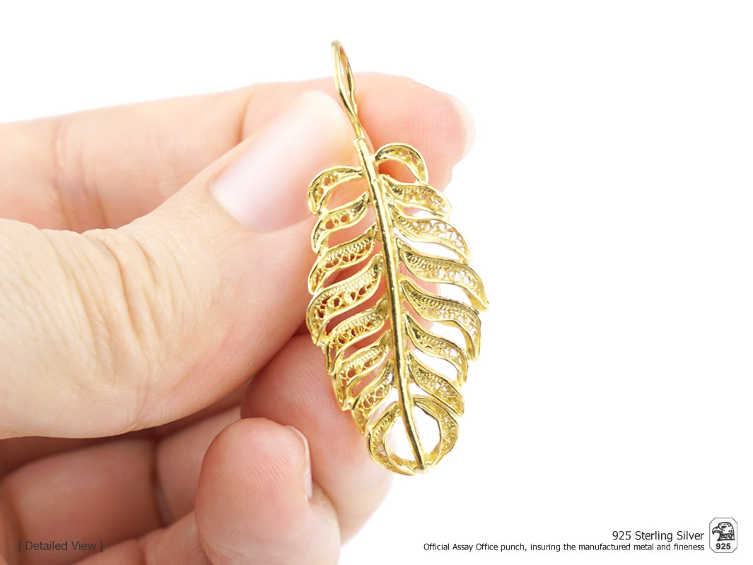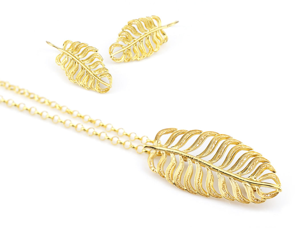 Parure Boucles D'Oreilles et Sautoir avec Feuille Longue, Filigrane Portugaise, Argent 925 Doré