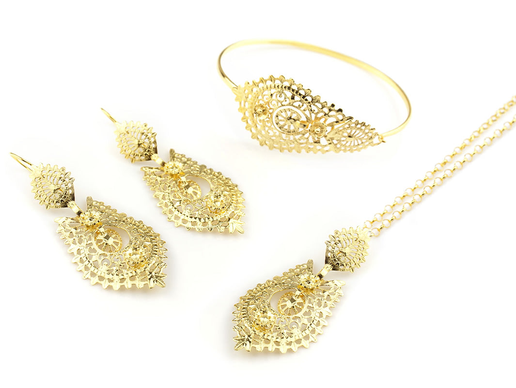 Élégant parure Reine ou Vianesa composé de Boucles d'Oreilles + Bracelet / Jonc avec grand motif + Collier avec médaille moyenne. Fabriqué au Portugal en Argent 925 Doré.