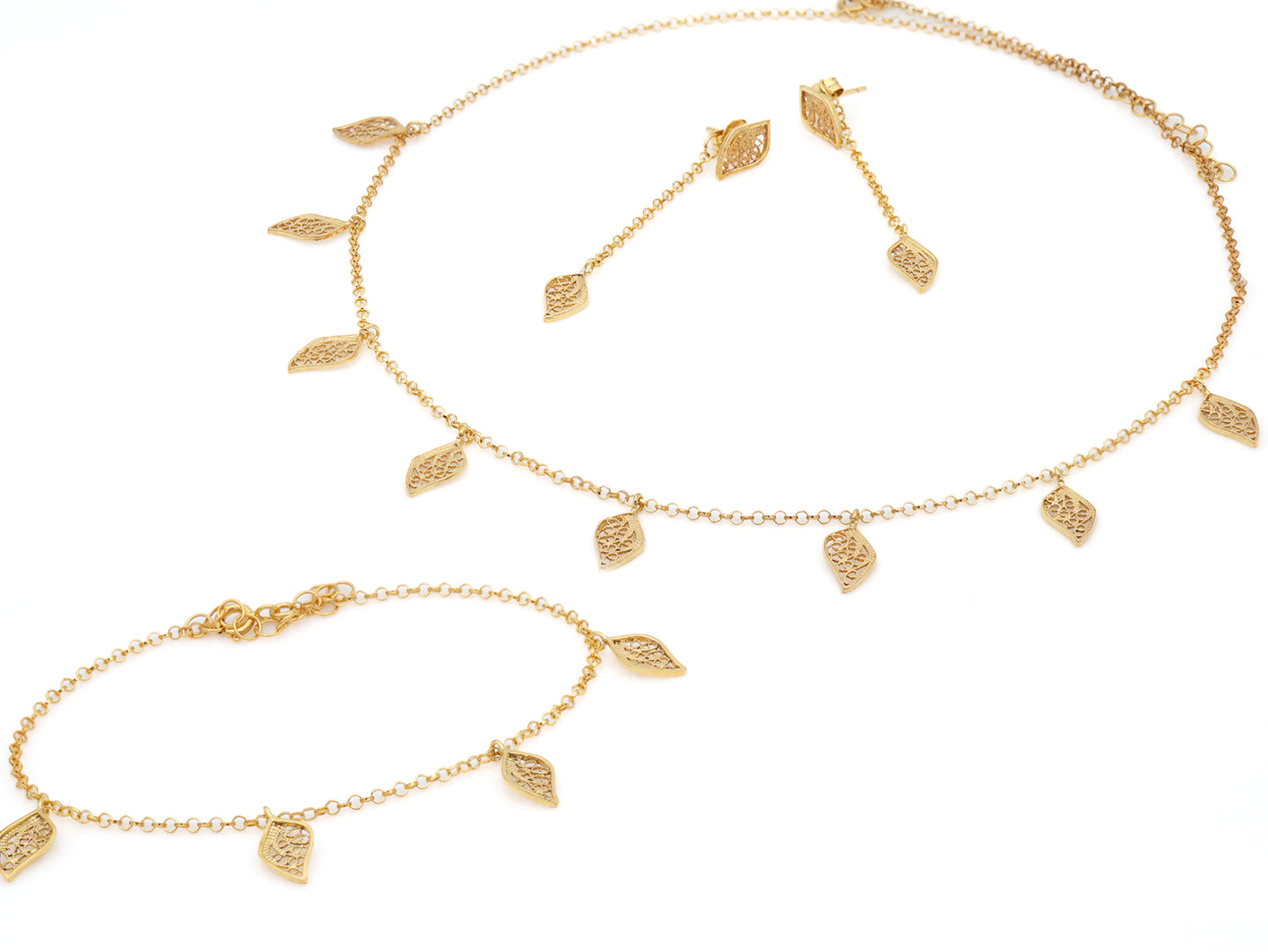 Élégante parure "Petites Feuilles" composé de Boucles d'Oreilles, Bracelet et Collier. Filigrane Portugaise, fabriqué au Portugal en Argent 925 Doré.
