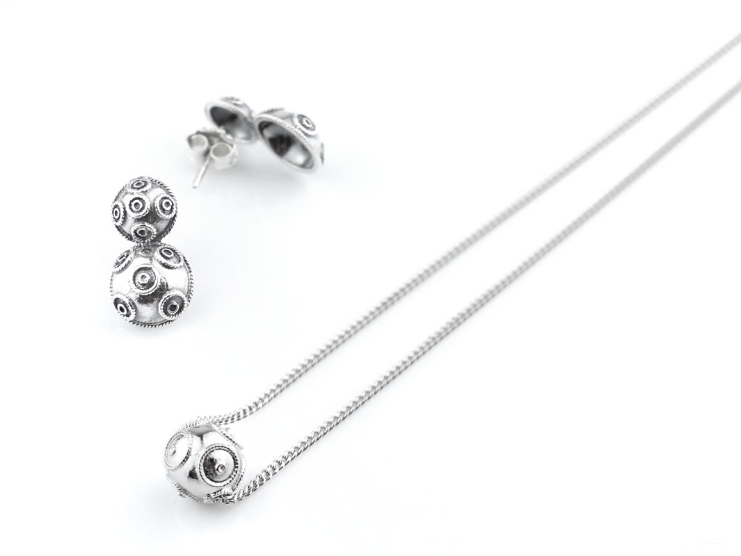 Parure Perles de Viana Boucles d'Oreilles et Collier, Filigrane Portugaise, Argent 925