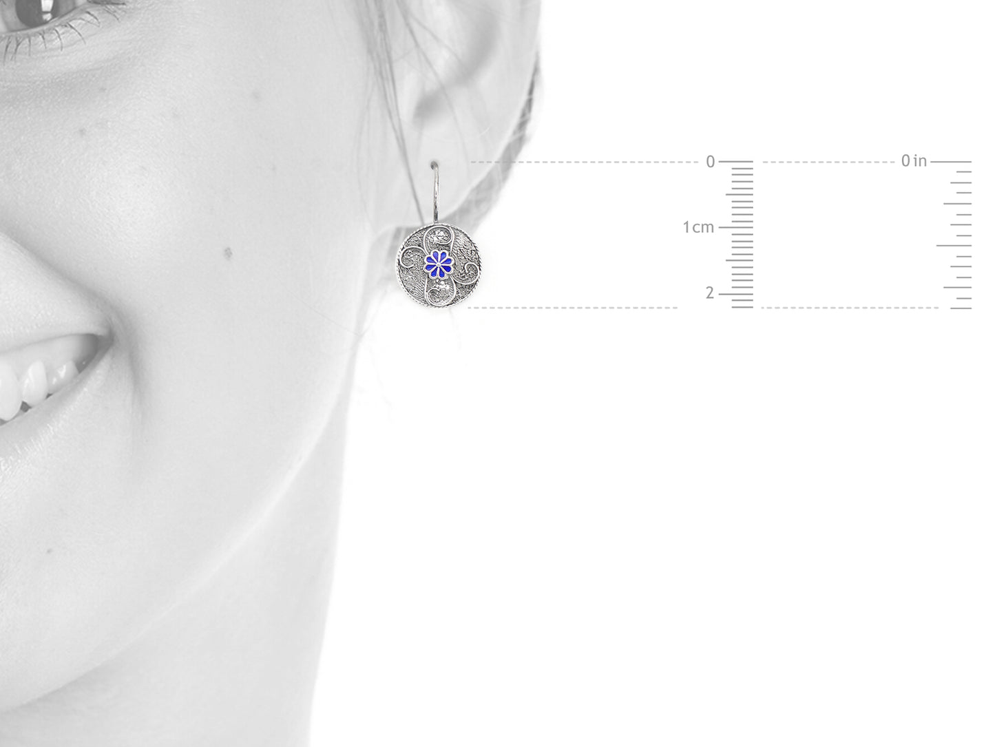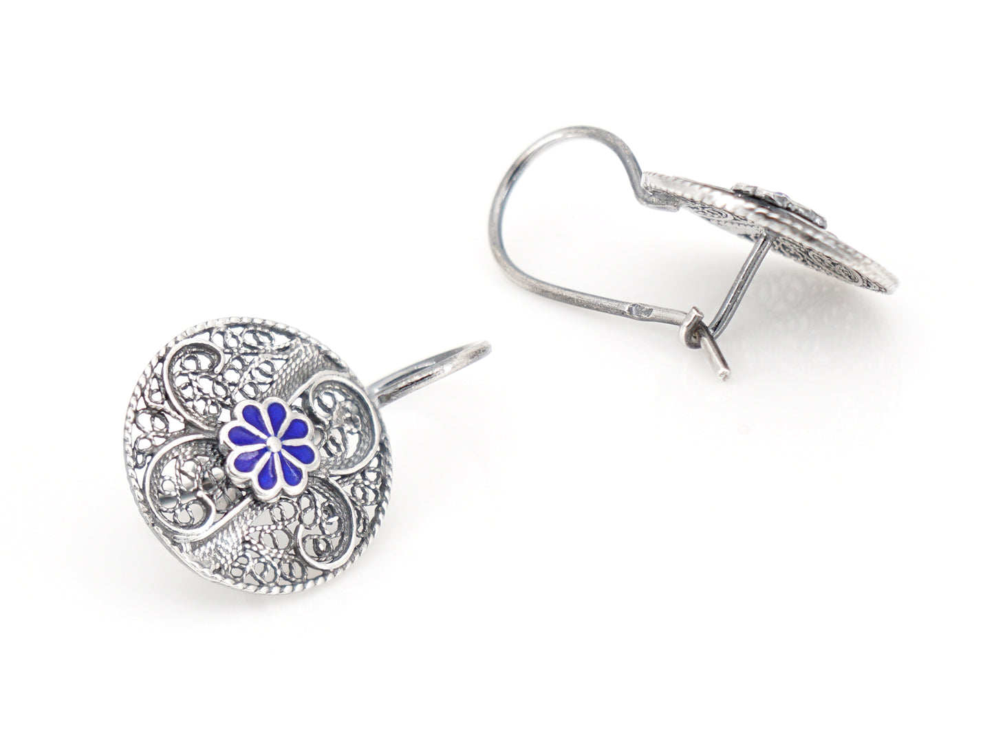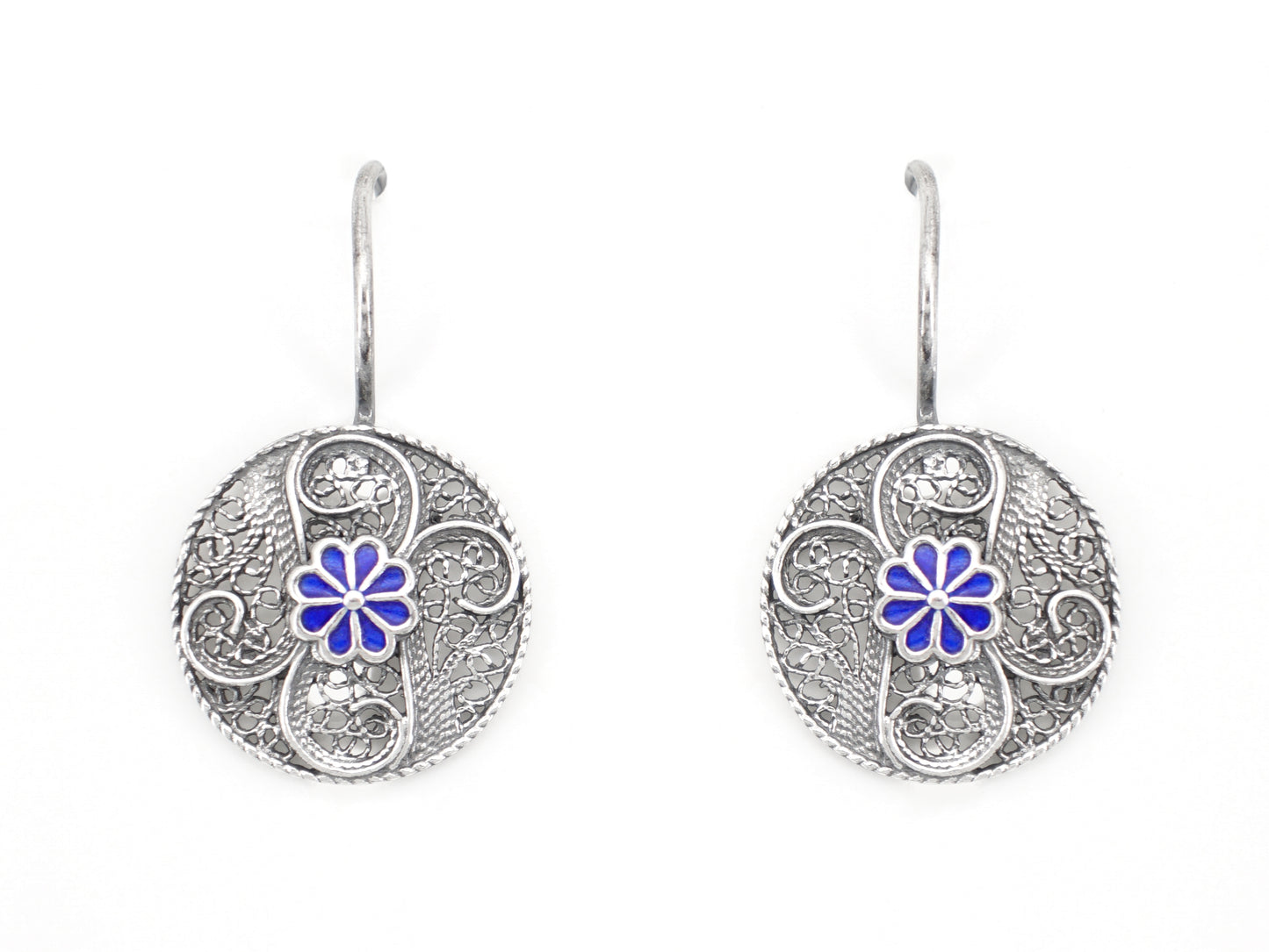 Élégantes Petites Boucles d'Oreilles Rondes avec Fleur Émailé en Bleu, crochet fermoir. Filigrane Portugaise, fabriqué au Portugal en Argent 925.