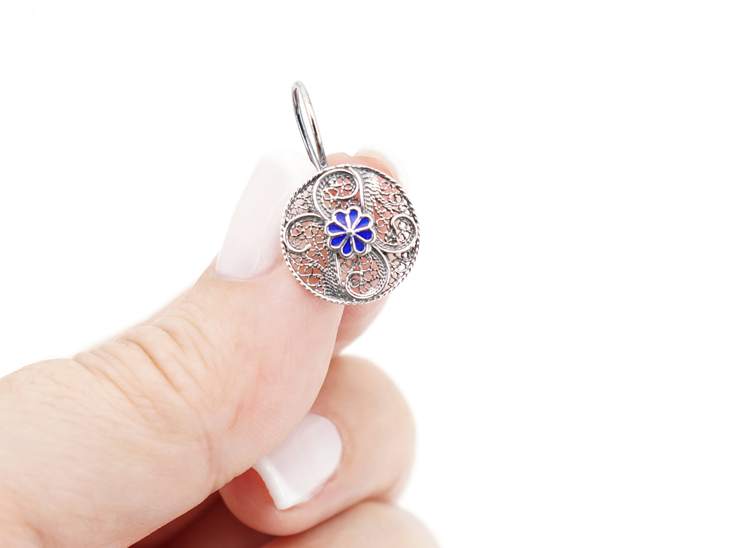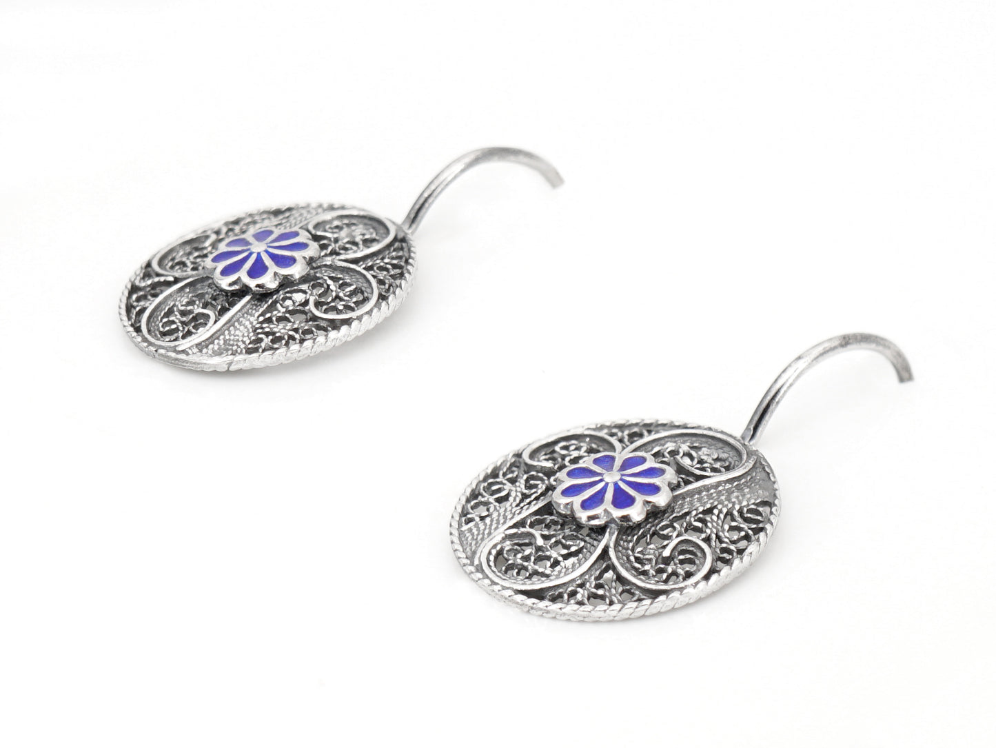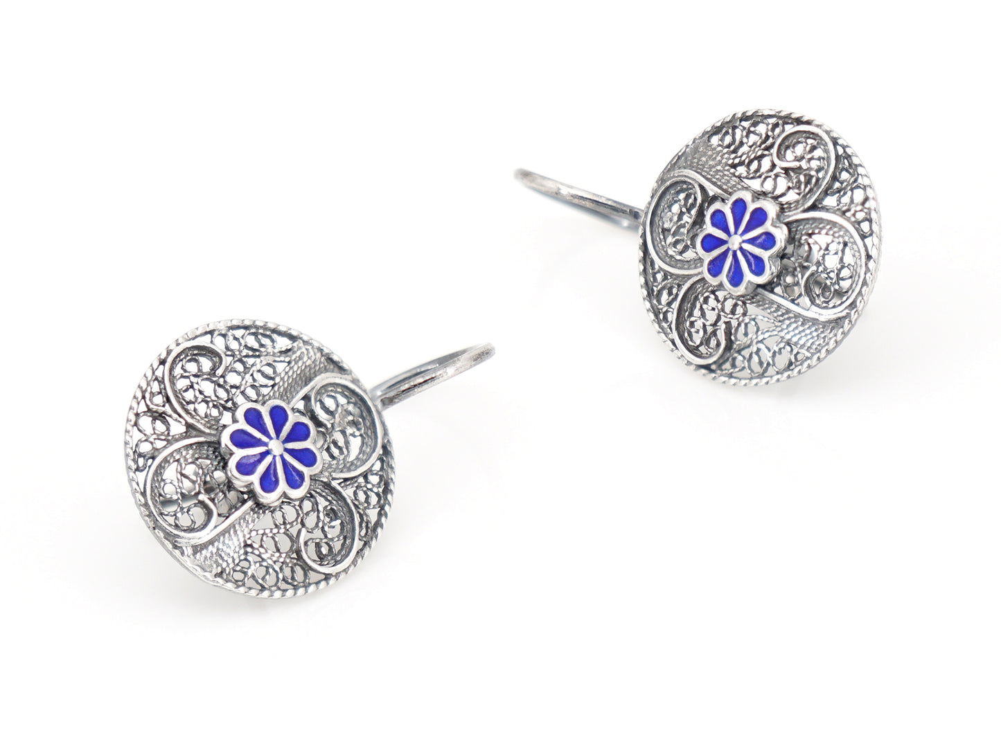 Élégantes Petites Boucles d'Oreilles Rondes avec Fleur Émailé en Bleu, crochet fermoir. Filigrane Portugaise, fabriqué au Portugal en Argent 925.