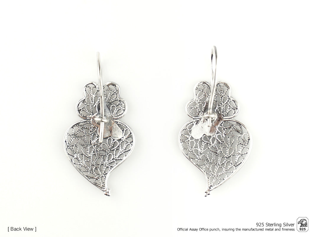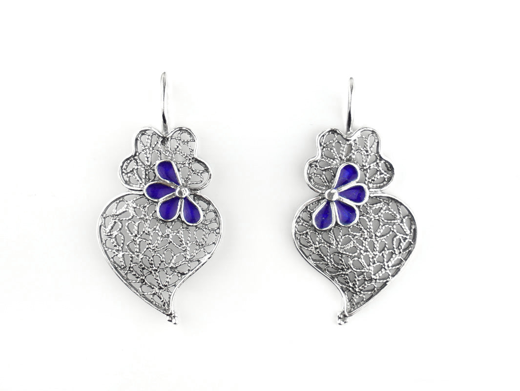 Élégantes Boucles d'Oreilles Petit Coeur de Viana aux pétales émaillés, crochets. Filigrane Portugaise, fabriqué au Portugal en Argent 925.