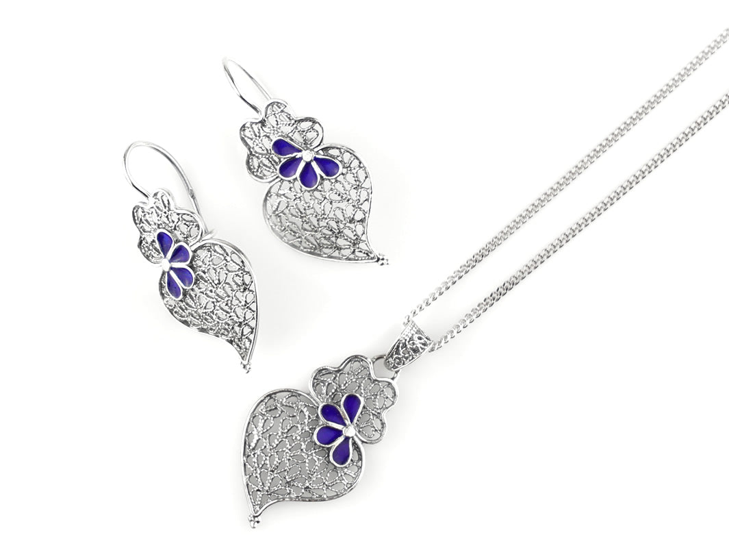 Élégante parure "Petit Coeur de Viana aux Pétales Émaillés" composé de Boucles d'Oreilles et Collier avec chaine réglable. Filigrane Portugaise, fabriqué au Portugal en Argent 925.